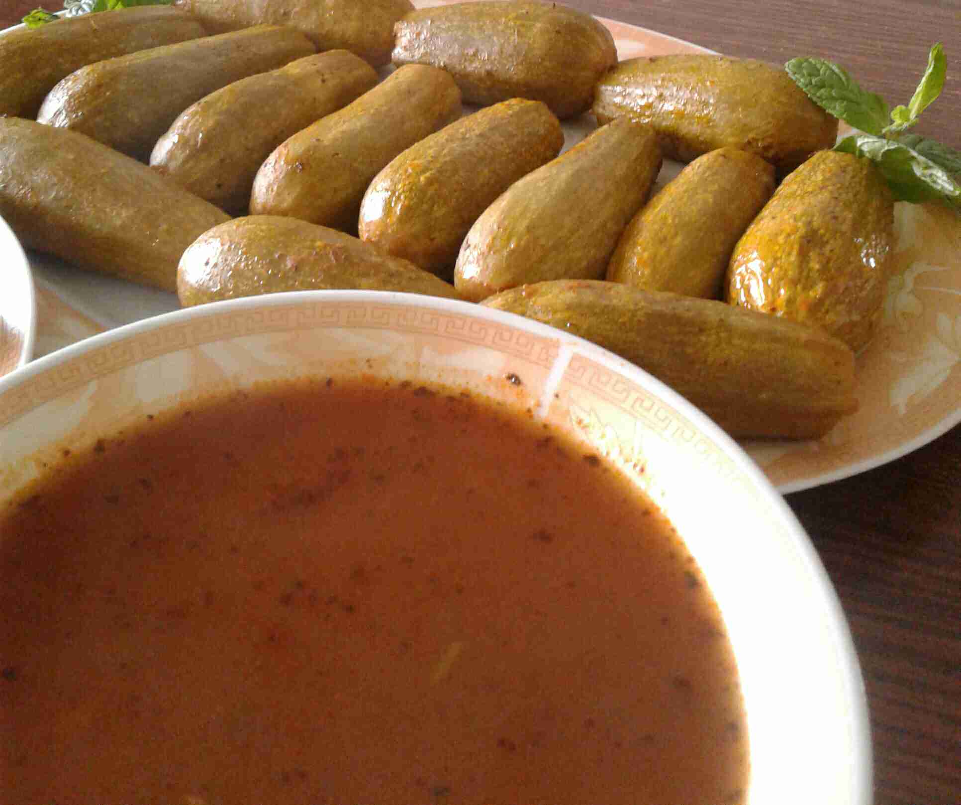 – نرفع حبات الكوسا بحذر ونضعها في وعاء كبير، ثم نترتبها في أطباق التقديم، ونقدم بجانبها أطباق الصلصة.
