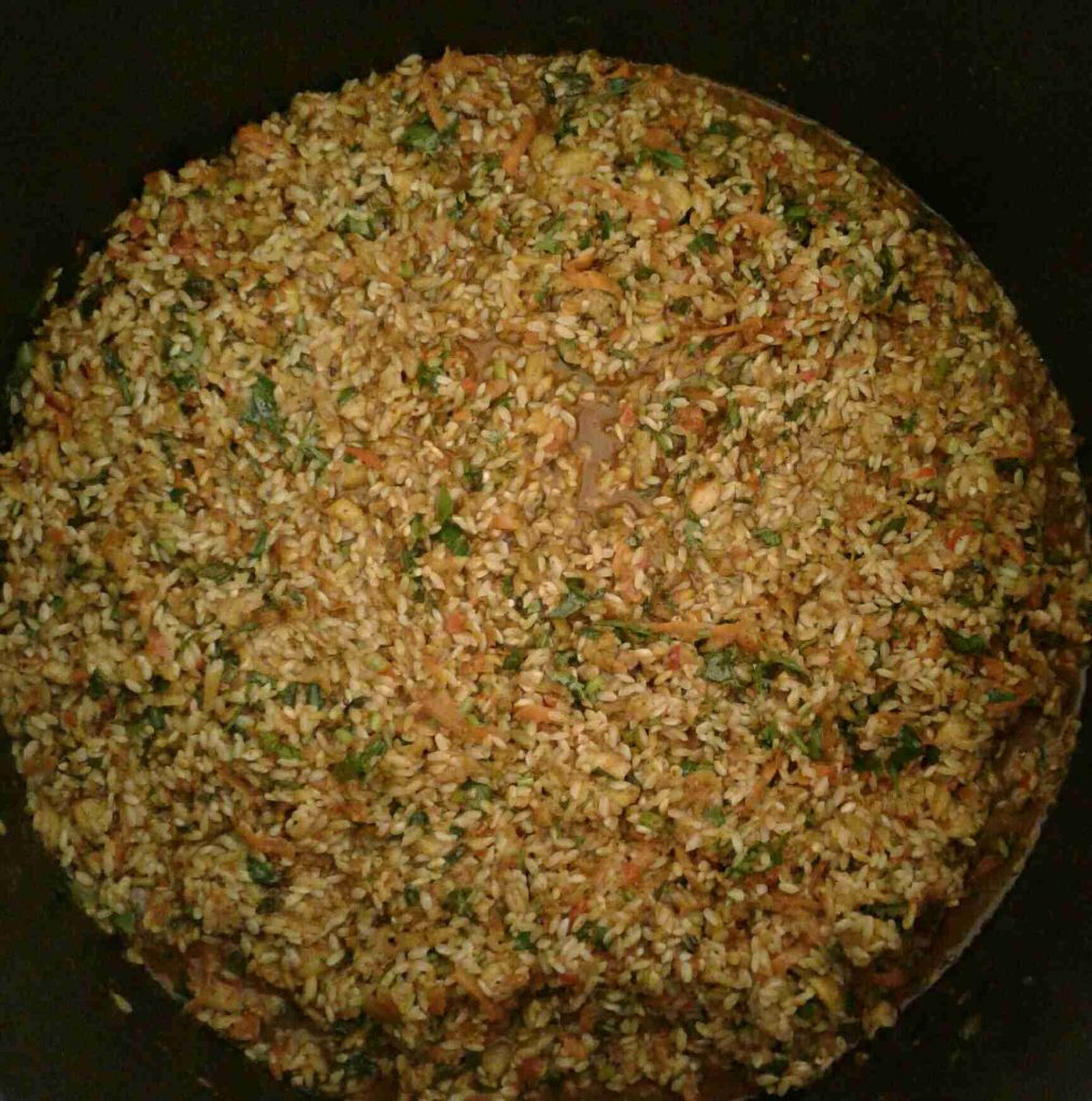 – في وعاء على النار: نضع كمية من زيت الزيتون والزيت النباتي ونضيف فوقه البصل ونقلبه حتى يأخذ اللون الذهبي ، ثم نضيف فوقه باقي الخضار (ما عدا البقدونس والنعناع)، ونقلب، ثم نضيف البهارات والمنكهات ونقلب، ثم نضيف البقدونس والنعناع ونقلب ونطفئ النار.