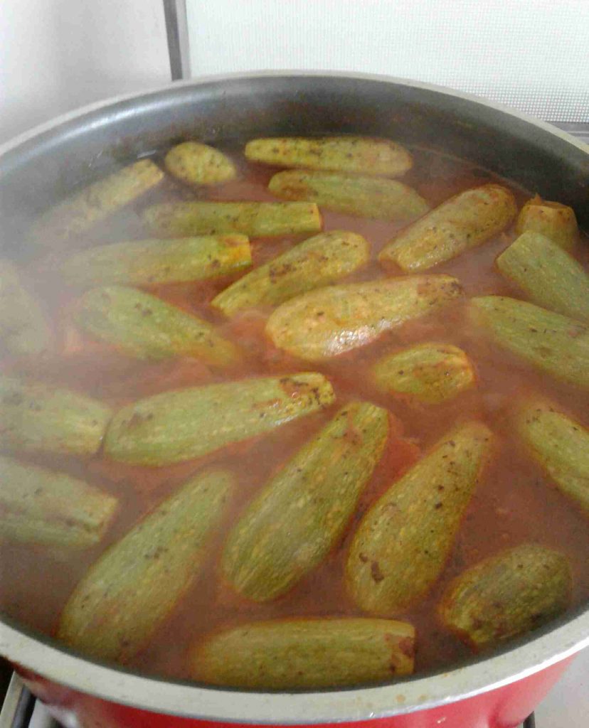 – في طنجرة على النار : نضيف أقل من نصفها ماء ونضيف كمية من الصلصة وملح وفلفل ونعناع ناشف ومكعبات المرق، ونتركها تغلي جيدا، ثم نضيف حبات الكوسا بحذر، وإذا احتاجت إلى المزيد من الماء والصلصة نضيف على أن يكون مستوى المرق على مستوى حبات المحشي، ونغطيها ونتركها مدة ساعة تقريبا.
