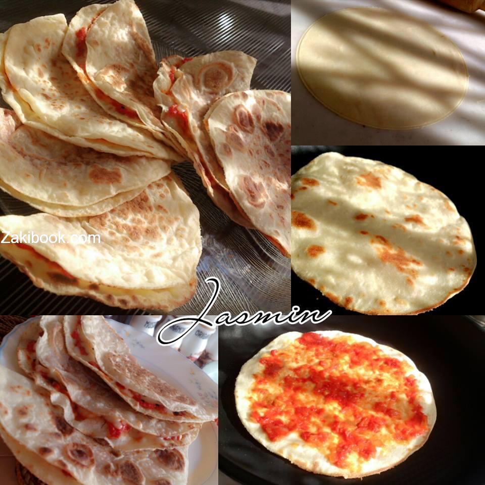 بعدها نمد كل كرة على سطح مرشوش بالطحين بالشوبك حتى تصبح رقيقة جدا ونضعها على الصاج (وهنا تم إستخدام مقلاة تيفال) لما يحمر أول وجه نقلبها على الوجه الثاني ونضع فوقه التتبيلة أو الحشوة المحضرة سابقا ، ثم نطوي الفطيرة حتى تنضج ونزيله وهكذا مع باقي دوائر العجينة حتى تنتهي ، وتقدم بألف صحة وهنا.