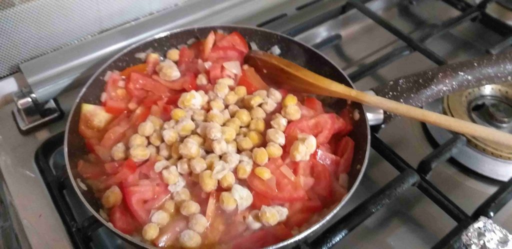 بنذبل البصلة عالنار وبعدين اللحمة المفرومة لحتى تتنشف ،،،بعدين بنضيف البندورة المفرومةع نار وسط مع التحريك كل شوي وبعدين الحمص الحب وسن الثوم المبشور ،،،ونضيف الملح والفلفل والبهارات بيصير عنا قلاية بندورة بلحمة،،،