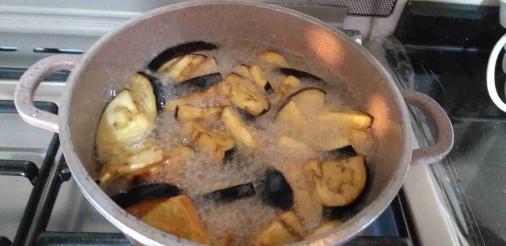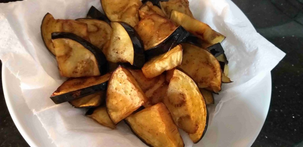 في هاي الأثناء بنقلي شرايح الباذنجان لحتى يحمروا
