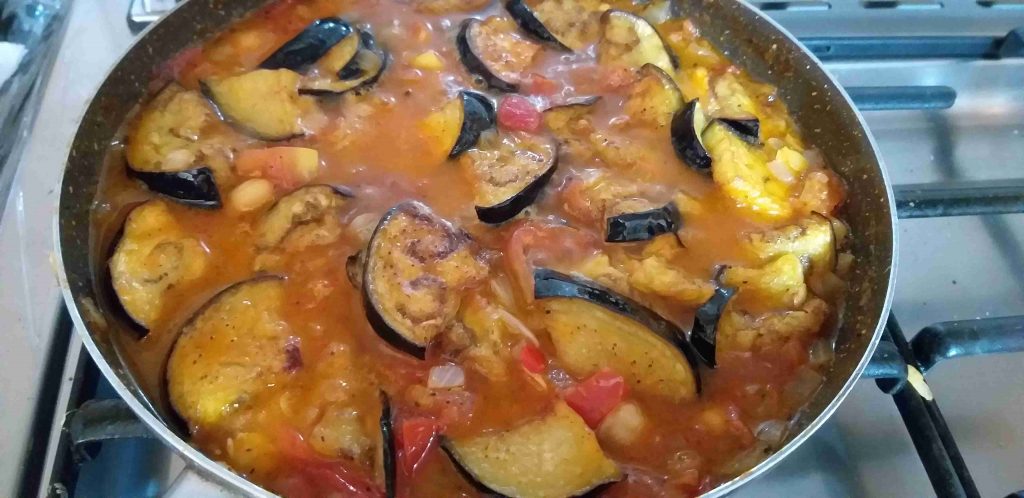 وبالأخير بنحط الباذنجان على القلاية مع صلصة البندورة اللي جهزناها ع نار هاااادية يتسبكوا ويفضل نكون مزبطين البهارات حتى ما نضطر نحرك الخليط لانه ما بدنا الباذنجان يتخلط ويذوب ،،،بدنا يضل مبين
