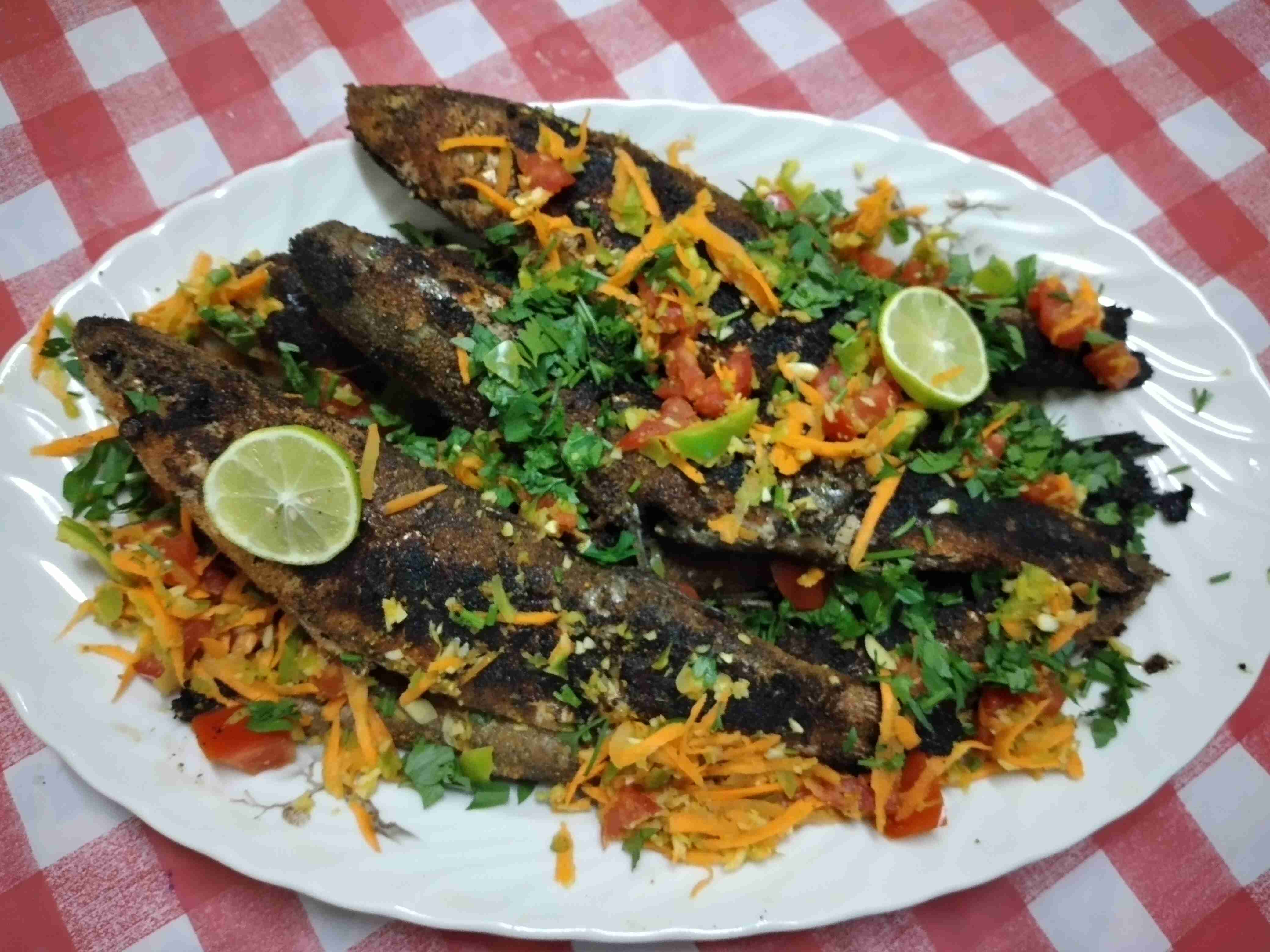 يقلب الخضار مع التوابل كويس جدا ثم نحشي السمك بالخلطه ويترك ١٠دقايق ثم نغلف السمك بالرده وعلي صاج الفرن يكون سخن جدا روشى عليه زيت وضعى السمك ٧ دقائق ع كل اتجاه ولا يقلب حتي يتغير لونه اول ما يطلع السمك نضع باقى الخلطه علي وش السمك