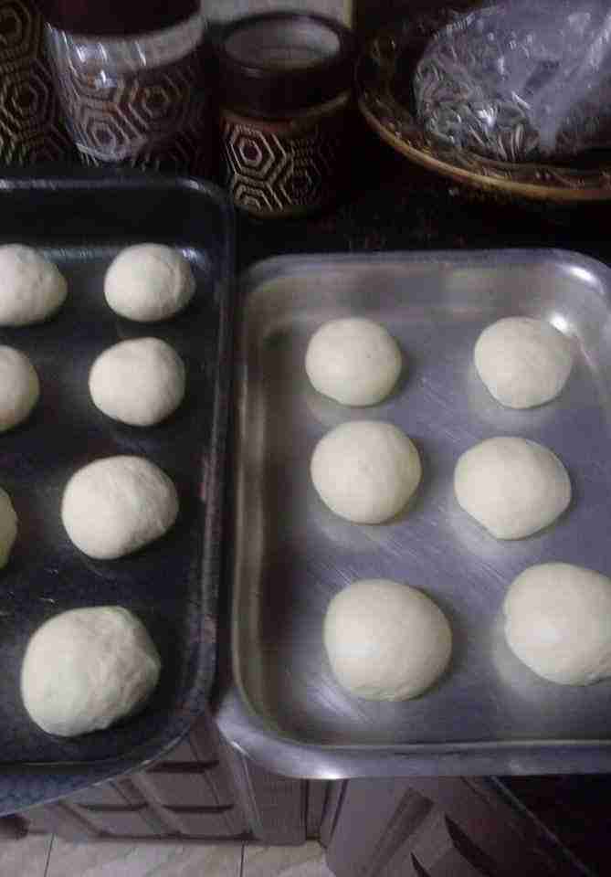 بعدها بتقطعي العجينة لكرات متوسطة وبتلفي كل كرة ع الطاولة بايدك حتى تصبح كالكرة ..وبتصفيهم بصينية مدهونة زيت .وبتضغطي على كل كرة شوية براحة ايدك وبتغطيهم وبتتركيهم كمان نص ساعة