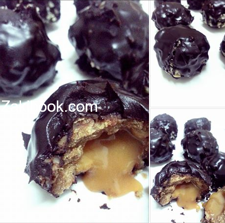 وندحرجها عالمكسرات نرجع نضعها بالثلاجة نص ساعه ثم نغطيها بالشوكوﻻته السايحه مره اخرى.