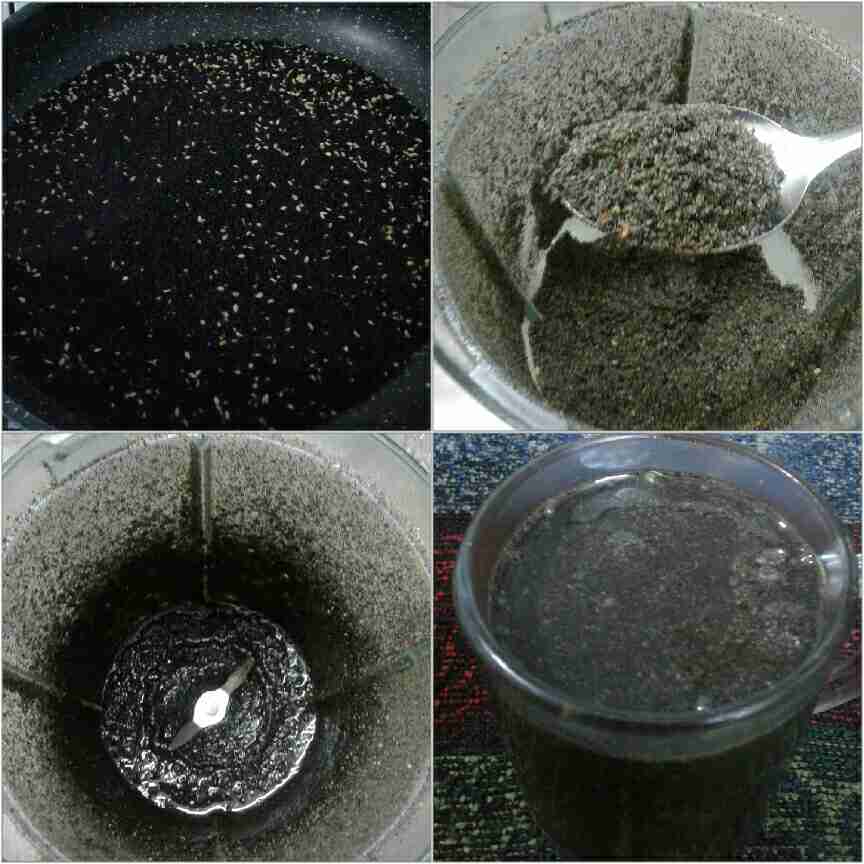 – في وعاء على النار: نضع السمسم والقزحة ونحمصها على نار هادئة إلى أن نشعر برائحة السمسم ويتغير لونه للون الذهبي، ثم نطحنها بالمطحنة إلى أن تصبح ناعمة، ثم نضع القليل من الزيت في الخلاط ونضيف فوقه القزحة المطحونة ونخلط ونزيد الزيت تدريجيا حسب الحاجة وحتى تمتزج المكونات وتصبح شبه قوام الطحينة.