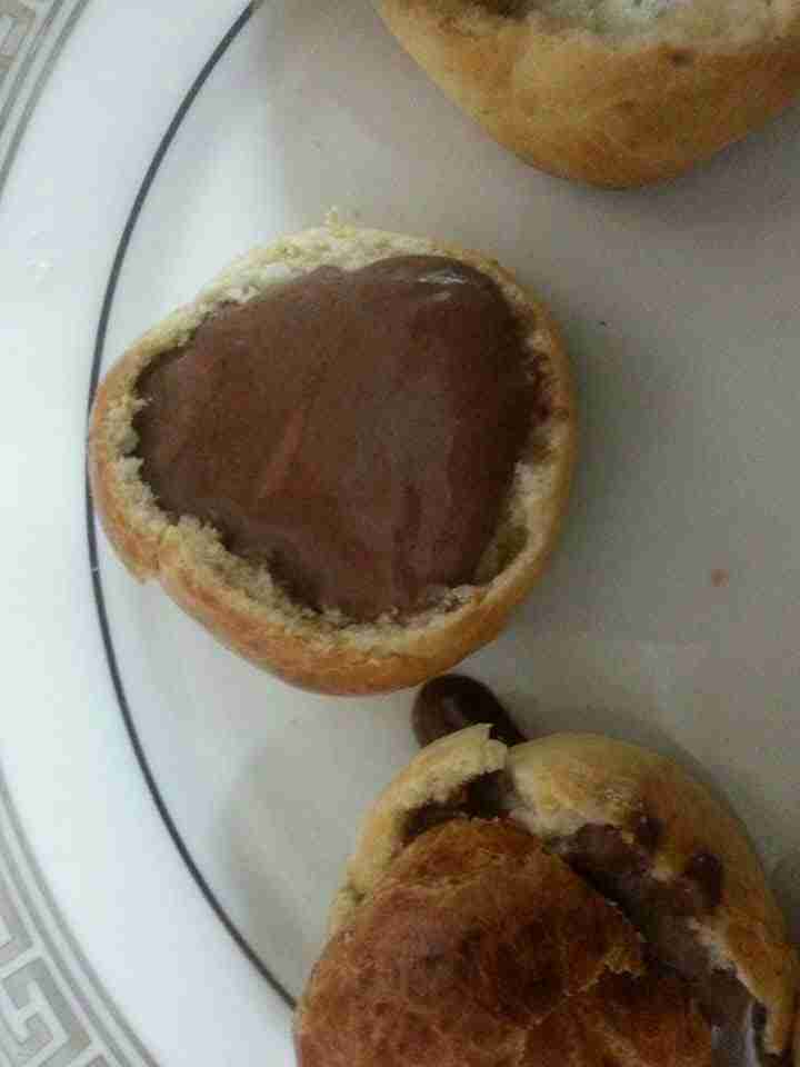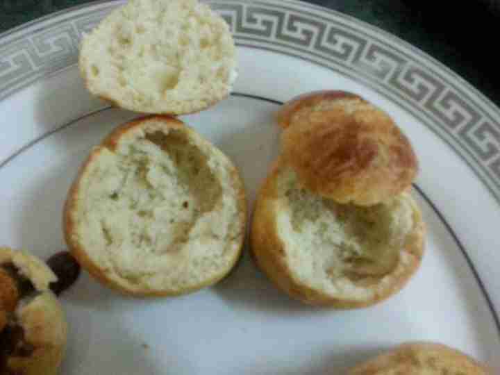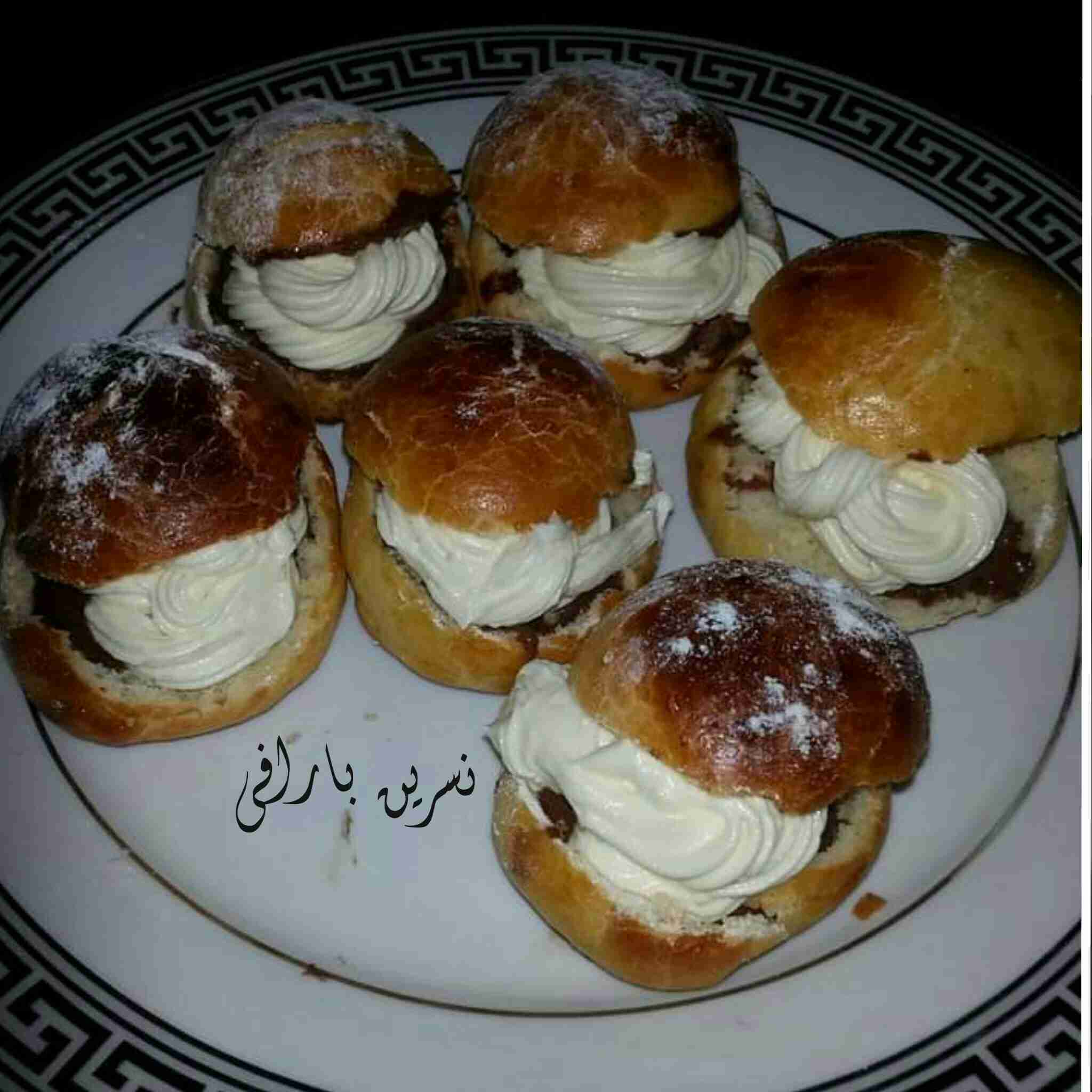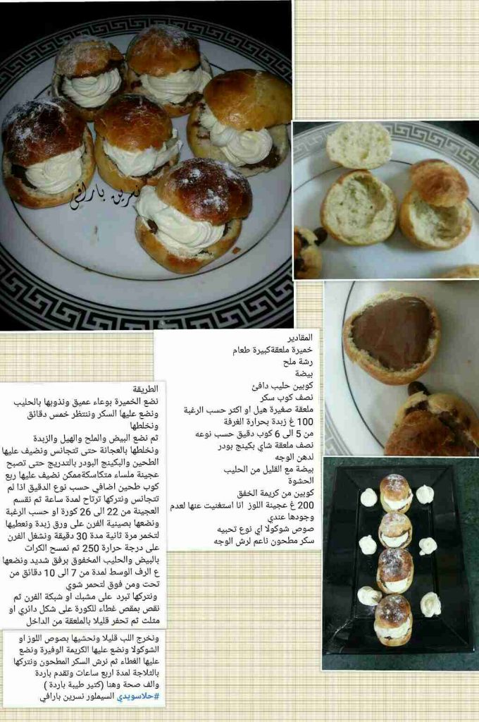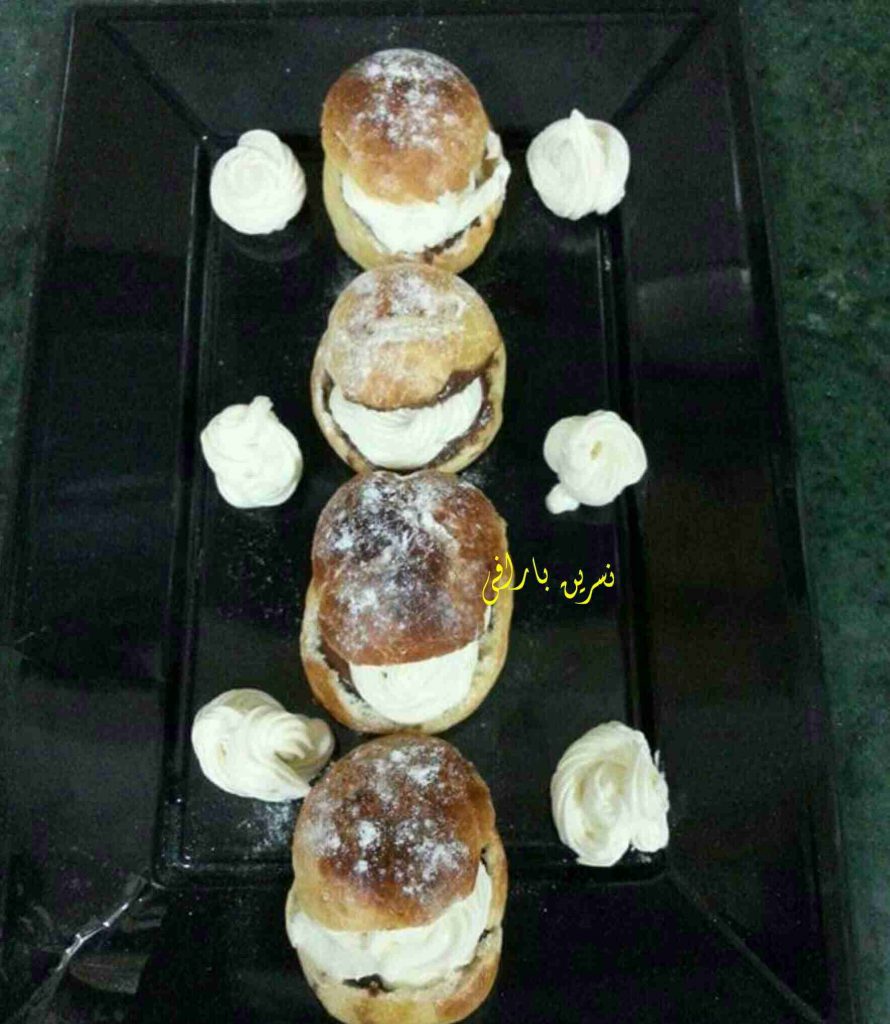 ونتركها تبرد على مشبك او شبكة الفرن ثم نقص بمقص غطاء للكورة على شكل دائري او مثلث ثم تحفر قليلا بالملعقة من الداخل ونخرج اللب قليلا ونحشيها بصوص اللوز او الشوكولا ونضع عليها الكريمة الوفيرة ونضع عليها الغطاء ثم نرش السكر المطحون ونتركها بالثلاجة لمدة اربع ساعات وتقدم باردة
