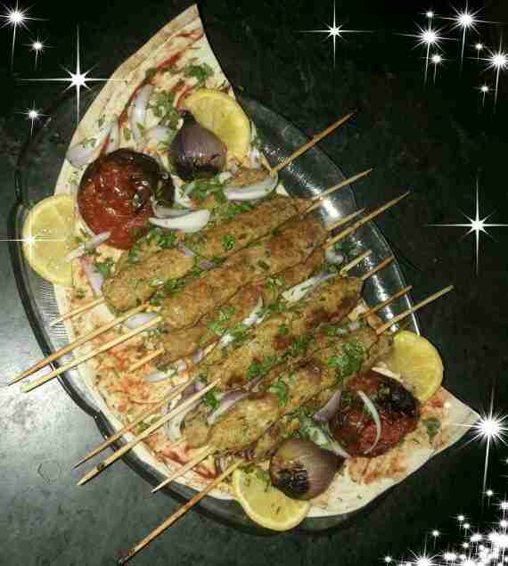 نجهز الفرن من فوق ع حرارة ٢٥٠ ونشك الطماطم والبصل باعواد الشواء وندخلها الفرن ونقلبها كل شوي لتنشوى نخرجها ثم نجهزالدجاج والبصل والثوم ونخلطهم جيدا ثم نضيف بقية التوابل والبقدونس نخلطهم جيدا ونغطيهم ونضعهم ٣٠ دقيقة بالثلاجة ثم نبل ايدنا بقليل من الماء وناخد كورات كبيرة ونشكها ع عود الشواء مع الضغط عليها شوي ونضعها ع جاط بايركس ع الجوانب من فوق وبقلبه الخبزة المدهونة بدبس الفليفلة والبصل والبقدونس وع الفرن من فوق ع حرارة ٢٥٠ مدة خمس دقائق ثم نقلبها لتاخد لون نضع بقلب البايركس قطعة قصدير نعملها مثل الصحن ونضع بقلبها زيت ونطفي فيها فحمتين ونتركها عشر دقائق لتاخد طعم الشوي ونطلعها ونضعها بطبق التقديم وتزين حسب الرغبة