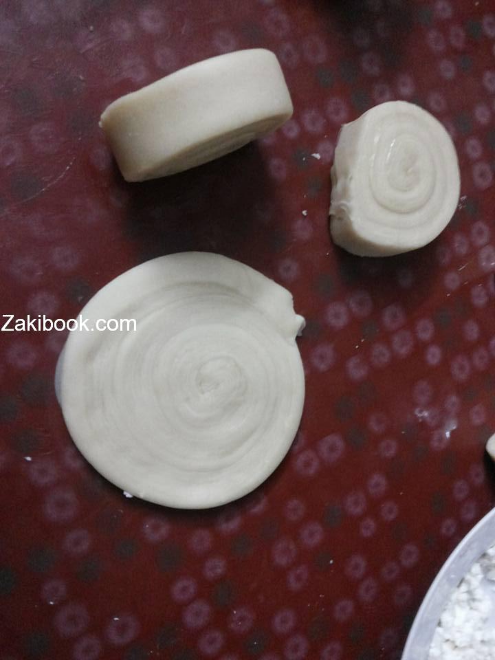 بنلفها متل الرول وبنقسمها لدوائر بسمك واحد سم بناخد الدوائر وبننييمها وبنضغط عليها و وبنفردها منيح وبنحشيها متل ما بنحشي القطايف