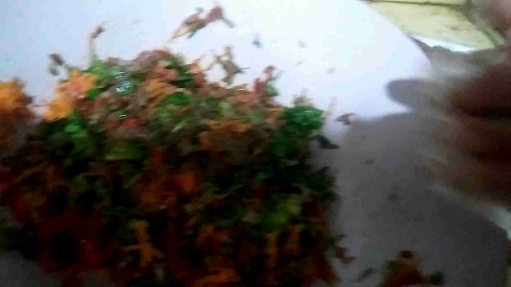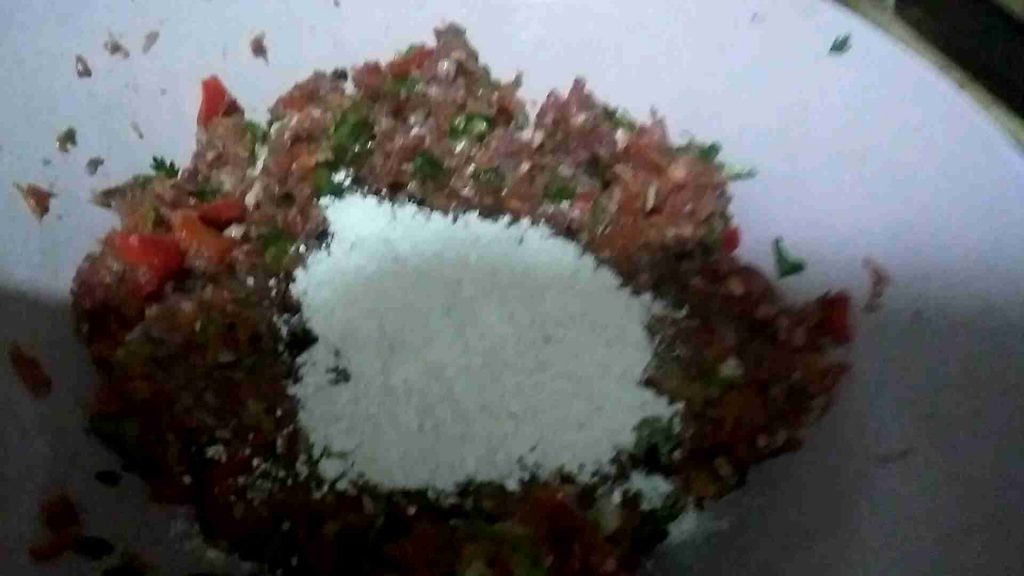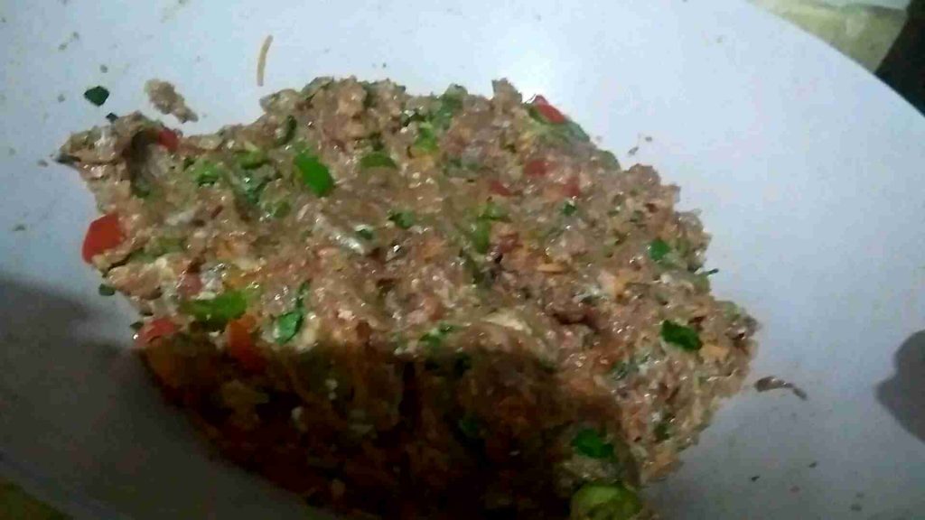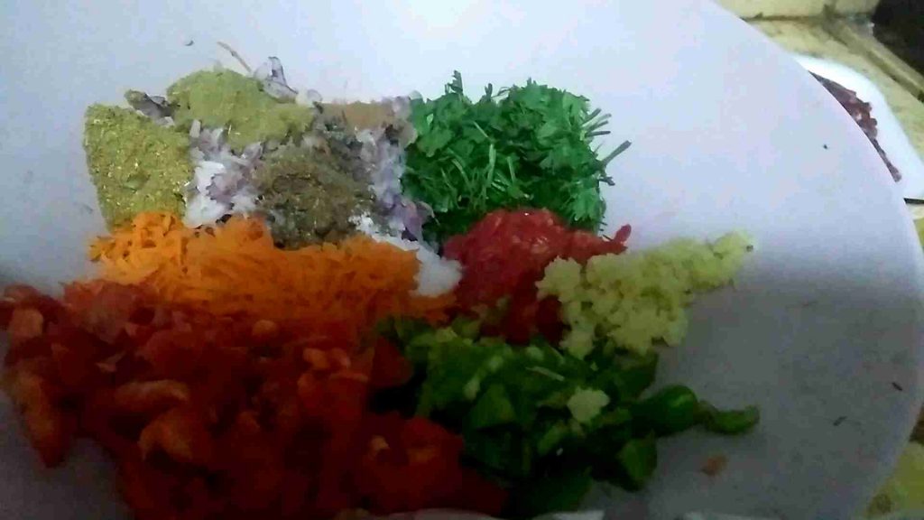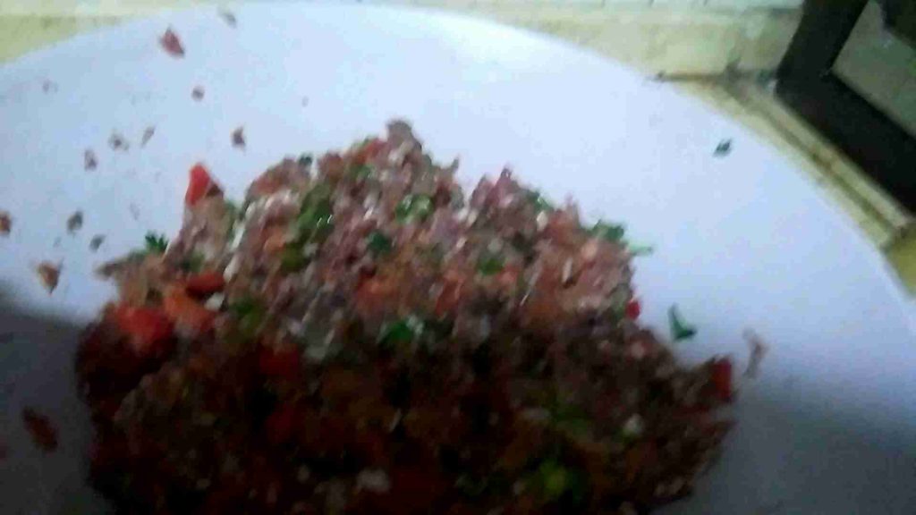 لعمل عجينة الحواوشي يتم خلط الخضار المفروم مع البهارات والملح وباقي التوابل مع بعض