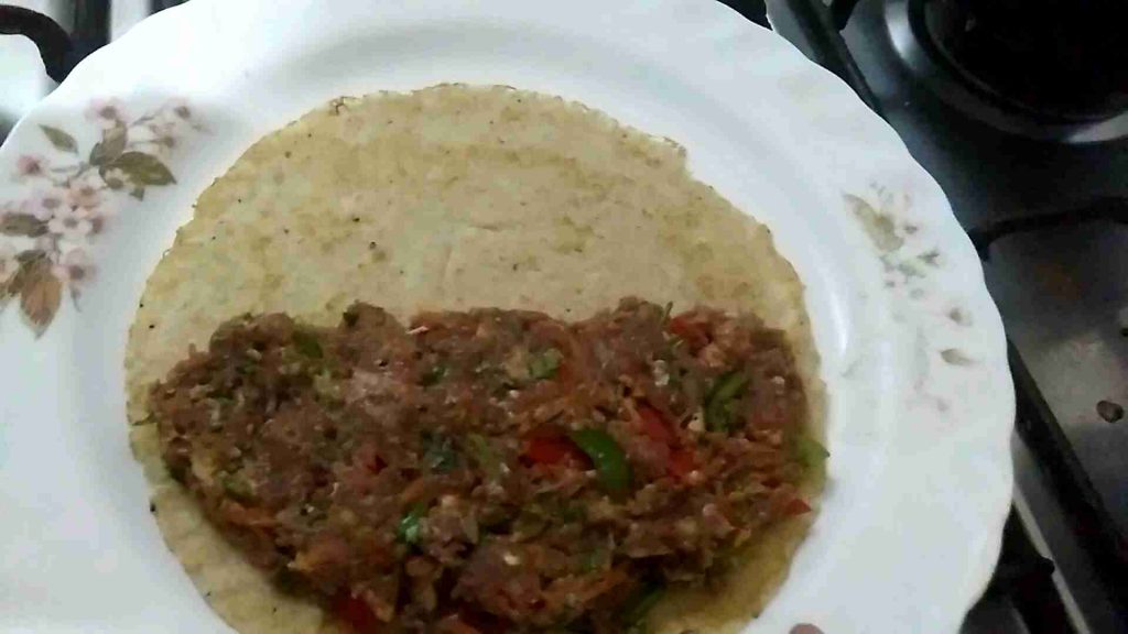 يتم اخذ الكريب ويوضع في نصفه فقط جزء من عجينة الحواوشي ثم يقفل
