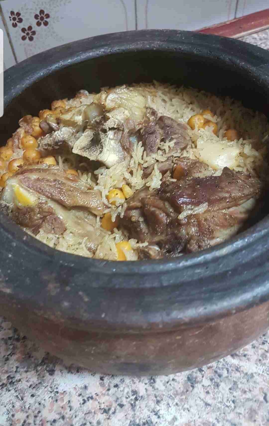 الوعاء الخاص (القدرة الفخارية) أو بديلاً عنه وعاء محكم الإغلاق، ادهني الوعاء بقليل من السمن البلدي.او الزيت أحضري الوعاء الموجود فيه اللحمة و باقي المكونات ضعي جزء من قطع اللحمه في قاع القدره وضعي خلطه الرز والحمص بطريقة مرتبة ضعي باقي اللحمه وضعي قليل من السمنه والزيت