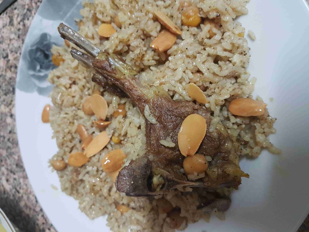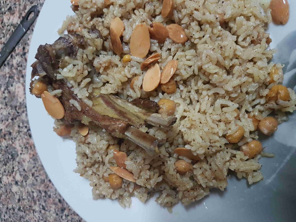 كيلو من لحم الخروف الطازج المقطع إلى قطع متوسطة الحجم. كيلو من الأرز الحبة المتوسطة (أرز مصري). رأس كبير من الثوم . ٣ عيدان من القرفة. ملعقتان كبيرتان من السمن البلدي. ملح -حسب الرغبة-. نص ملعقه صغيرة من القرفة الناعمة. رشة فلفل أسود ملعقه بهارات السبعه ٢ كوب من الحمص الحب المسلوق مكسرات للزينة ( لوز محمص أو صنوبر). طريقة التحضير اغسلي اللحمة جيداُ وضعيها مع البهارات وبصله على النار حتى تنضج نصف استواء انقعي الأرز بالماء الدافئ لمدة ربع ساعة تقريباً . أحضري وعاء الطهي (الطنجرة) وضعي فيها ملعقة من السمن البلدي، ثم أضيفي الثوم المقشر كاملاً واتركيه على النار مع التحريك حتى يحمر قليلاُ. أضيفي الحمص الحب الى الوعاء مع تحريكهم قليلاً نضع الرز المنقوع والمغسول ونحرك أضيفي القرفة ورشه ملح والبهارات المذكورة أتركي جميع المكونات على نار هادئة لمدة ٥ دقائق أحضري
