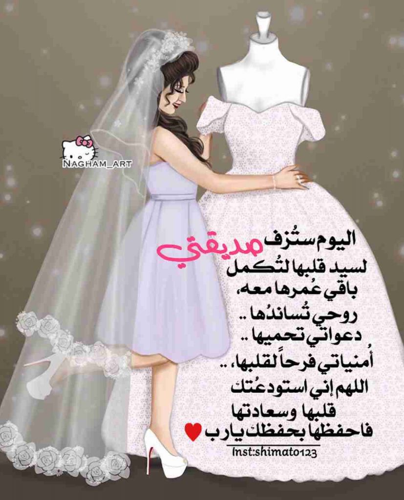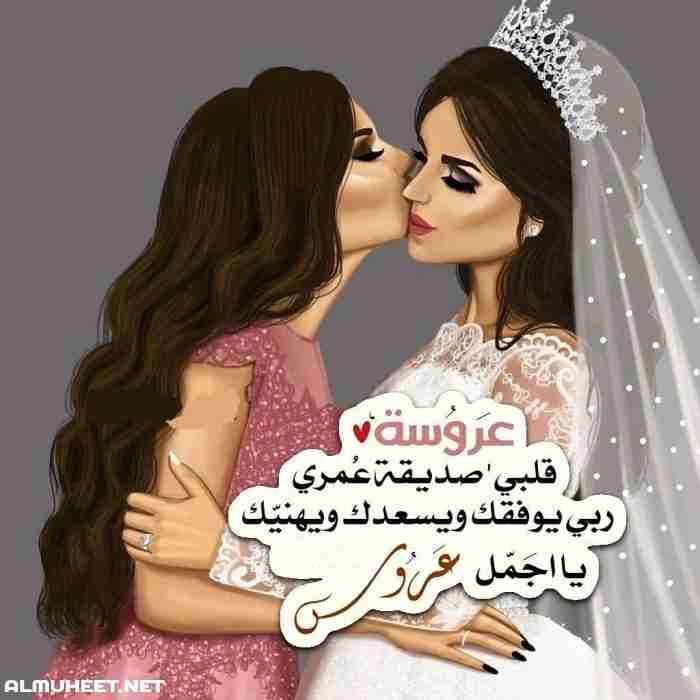 صديقتي الحبيبة، أقاوم كل مشاعر السعادة التي تعتريني في هذه اللحظة وتمنع كلماتي من التدفق.. لأكتب لكِ عن مشاعر الفرح والسرور التي تغمرني، وكلماتي تتراقص طربًا على نبضات قلبي، فأشدو لكِ بلحن سعيد: بارك الله لكِ وبارك عليكِ، وجمع بينكما على خير. *ألف هلا يا عروسة وألف مبروك… جعل السعادة والهنا قدّامِك وأشرقي كالبدر في طلّتكِ يوم زفافك… حورية تلفت نظر من شافها. *ألف مبروك تحلق فوق هامة العروس… والعبارات مزيّنة بعقود من ورود… كل قلبٍ صار يخفق بدعاءٍ في السجود… يا رب بارك ووفق واجعل الآتي سعود. *بكل الصفا والود، وروعة أريج الورد، أبارك لكِ زواجكِ… عسى السعادة في حياتكِ تزدهر، والحظ يضحك لكِ على طول دنياكِ.