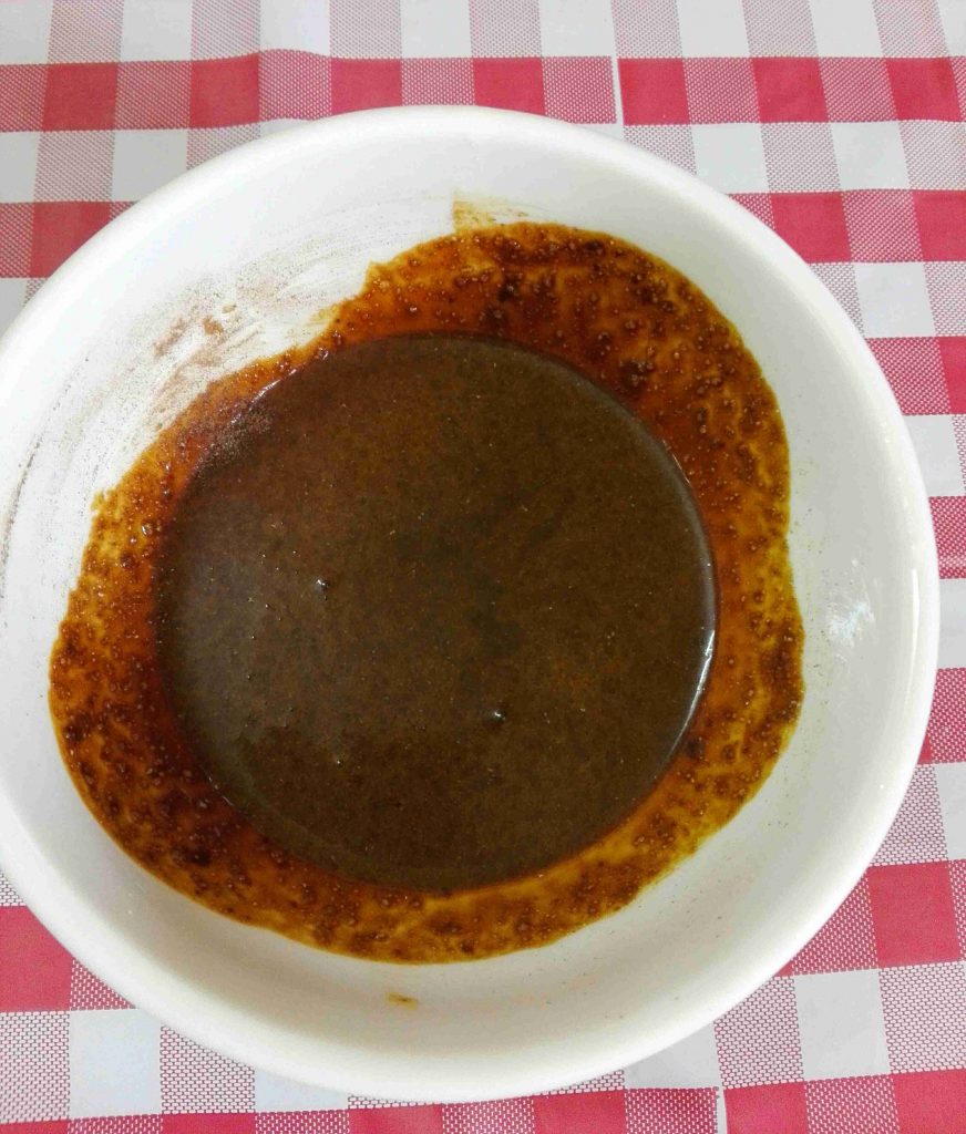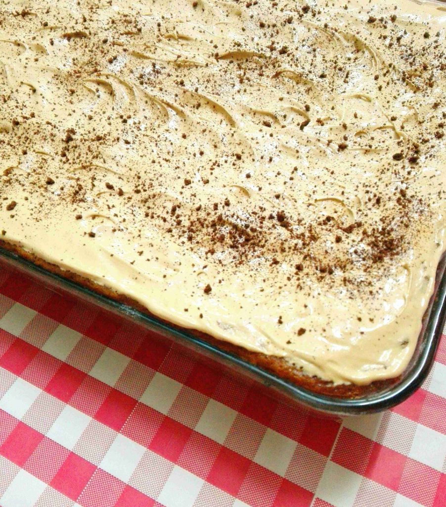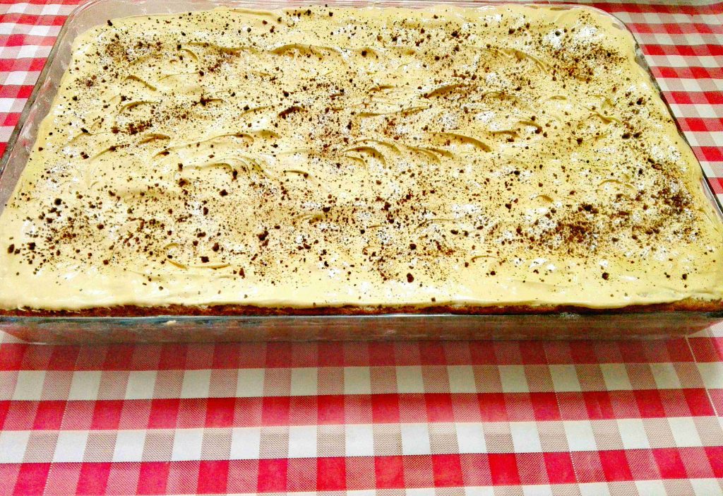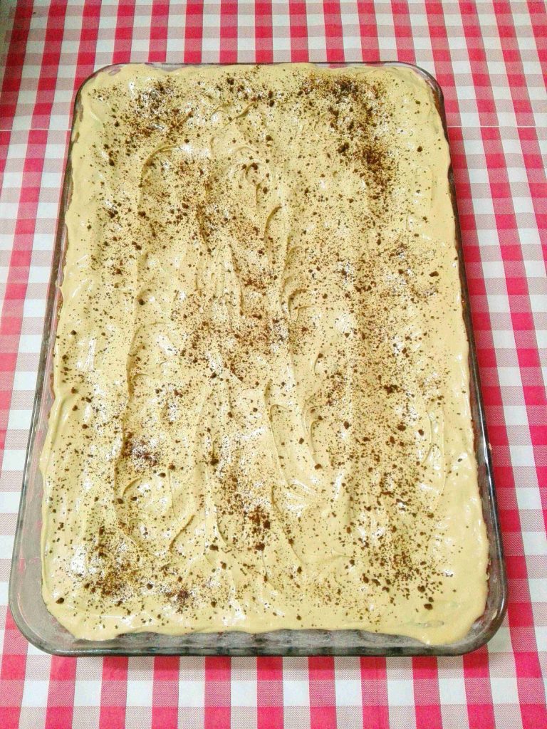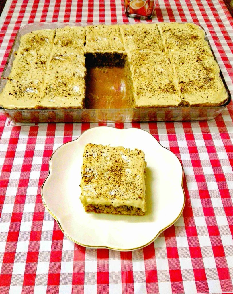 وهي تسقية الكيكه بكوب ماء مذوب فيه معلقة نسكافيه ومعلقتين سكر بعد ما ترتاح الكيكه بعشر دقائق بنسقيها وبنغطيها وبنتركها تتشرب لوقت التقديم وممكن الاستغناء عن هالخطوه بس هي بتعطي الكيكه ترطيب …