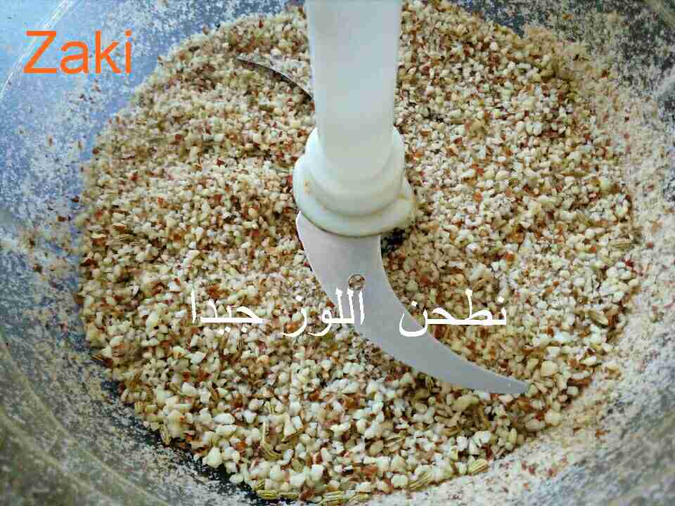 في هذه الأثناء نطحن كمية اللوز في محضرة الطعام جيدا ،(يمكن تحمير اللوز قبل الطحن كما يمكن استعماله مجروش فقط أنا أفضل عدم تحميره للإستفادة من قيمته و أفضل أيضا طحنه)