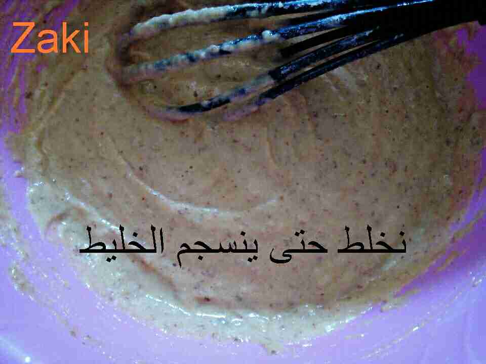 نضيف دقيق القمح الكامل المغربل و خميرة الحلويات، و نخلط الكل حتى نحصل على قوام كيك أثقل من الكيك العادي.