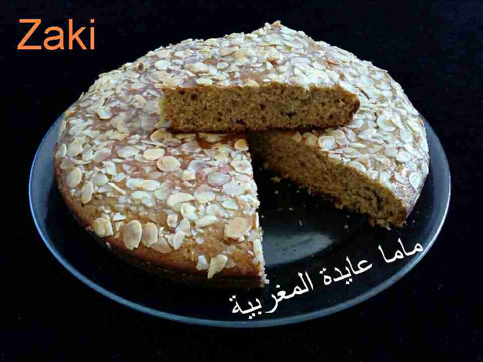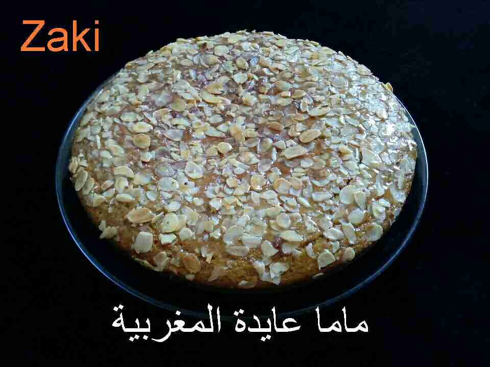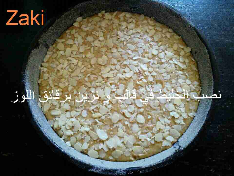 نصب الخليط في قالب مذهون و مرشوش بدقيق القمح الكامل، و نرش على الوجه شرائح اللوز.