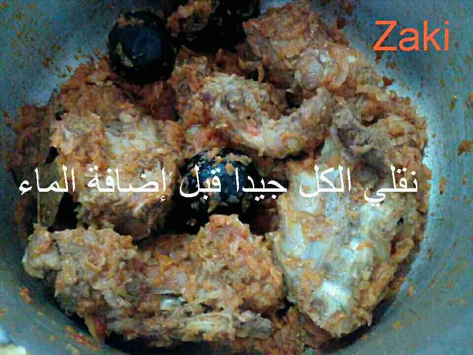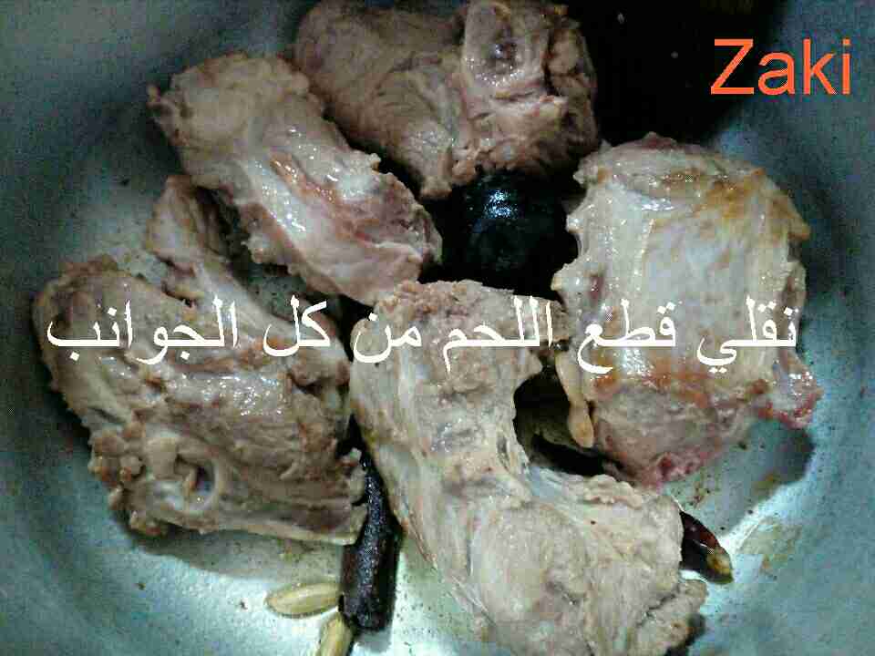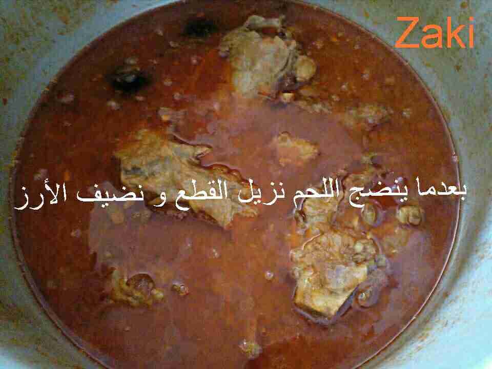 نفتح الطنجرة و نزيل قطع اللحم و فائض الذهون إذا كانت كثيرة(ممكن كمية الذهون تكون مناسبة لطهي الأرز إذا كانت كثيرة نزيل كمية منها)