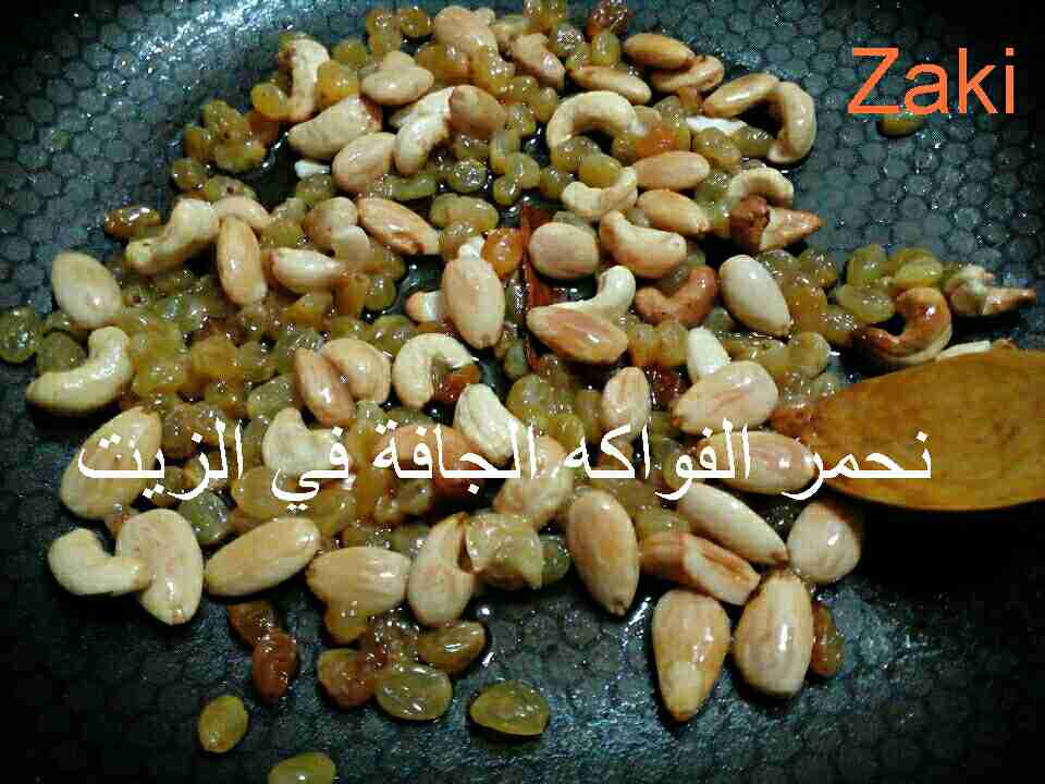 خلال مدة طهي اللحم نقلي اللوز في زيت حتى يبدأ يتحمر نضيف الزبيب ثم الكاجو و القليل من القرفة حتى يتحمر الكل و نزيله جانبا.