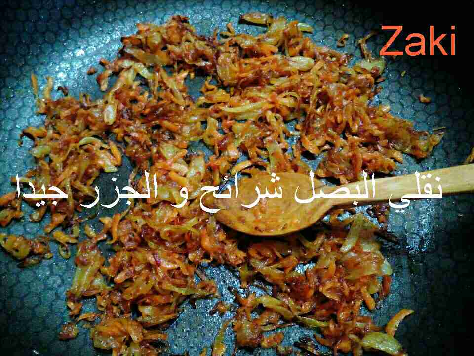 في آخر دقائق نضج الأرز نضيف نصف كمية البصل و الجزر المحضر، و بعدما ينضج نغطيه و نترك الأرز يرتاح قليلا.