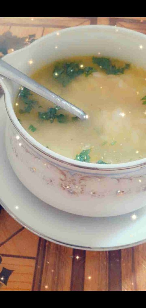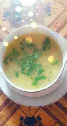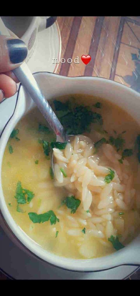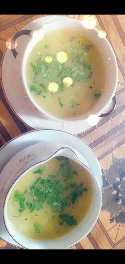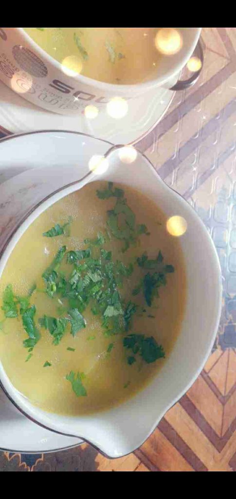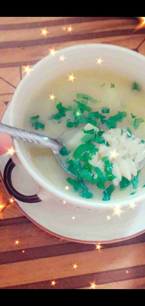 نقلي البصلة بالزيت لحتى تذبل البطاط ونضيف مرقة الجاج ونتركها لحتى يغلو ونضيف المعكرونة اللي هي لسان العصفور ونتركها لتغلي ونوطي النار عليها ونترها لتستوي وتزين بالبقدونس وبالعافية ان شاء الله