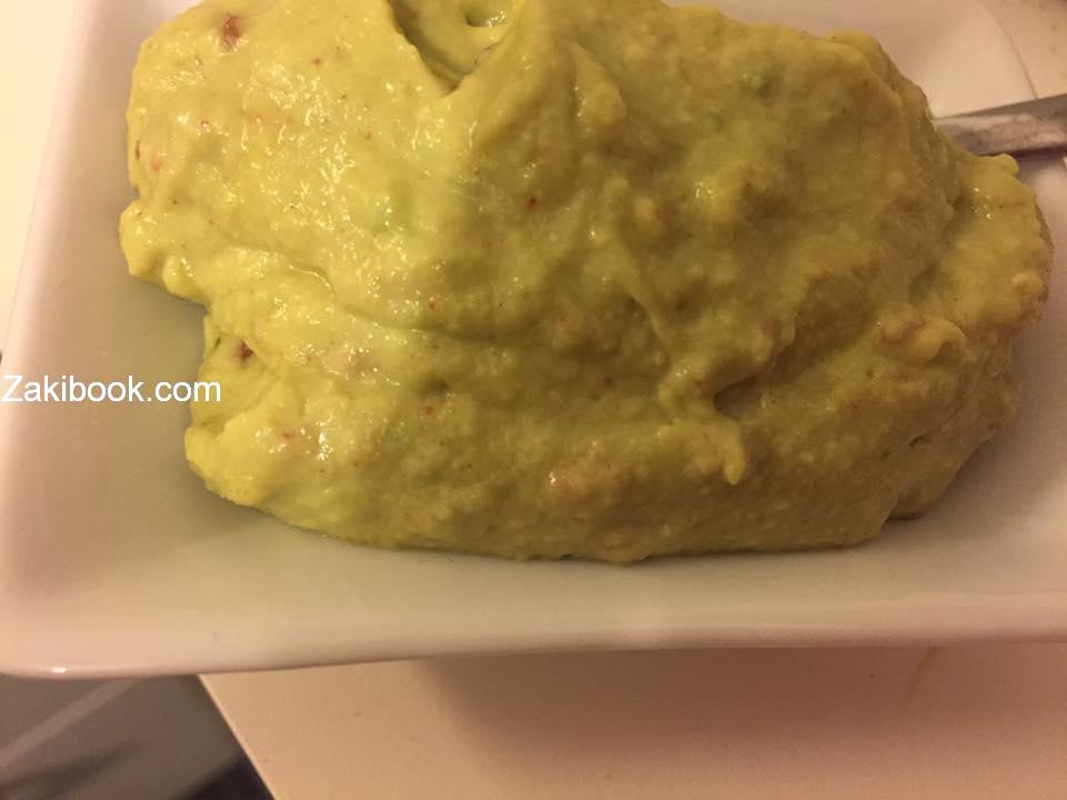 حبتين افوكادو يطحنوا ناعما سواء بالشوكة او بمطحنة يدوية يضاف نصف م ص بودرة ثوم وربع م ص بوردة البصل ورشة كمون ورشة كزبرة يابسة ورشة بذور الحر وملح وملعقتين الى ثلاث من الكريم فريش ( sour cream ) يخلطوا جيدا ..
