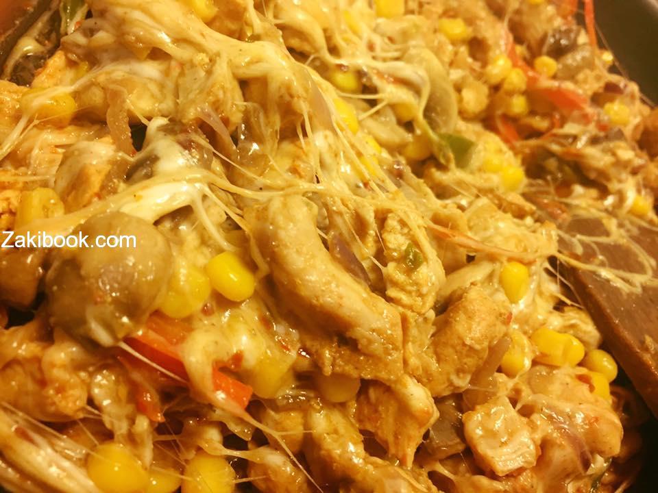 انقل المقدار الذي سوف يؤكل فوراً الى مقلاة ثانية على النار ثم أقوم بتقطيع الدجاج اكثر بملعقة خشبية واضيف الجبن واحرك حتى تذوب وأطفئ..