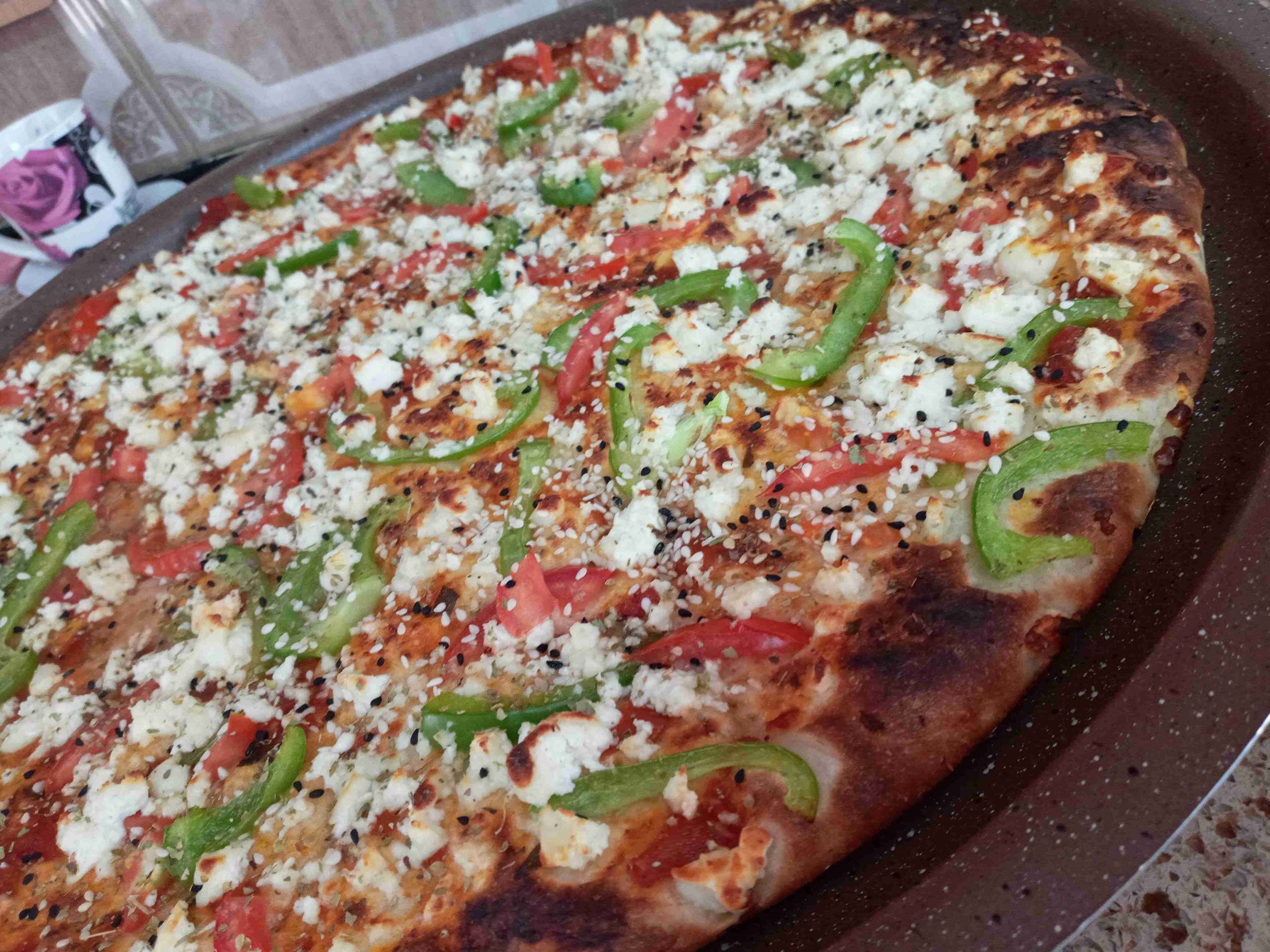نضع الطحين والخميره وسكر والملح مع بعض وبعدين نضع الماء ونعجنهم مع بعض لتصبح عجينه متماسكه نضع الزيت مع العجينه ونعجنها مع بعض ونترك العجينه لمدة عشر دقائق .ويعدين نفرد العجينه في الصينيه ونضع عليها صلصة البيتز الجاهز ونضع الخضار والجبنه وبعد تزين الصينيه نضعها في الفرن على نار متوستط الحراره