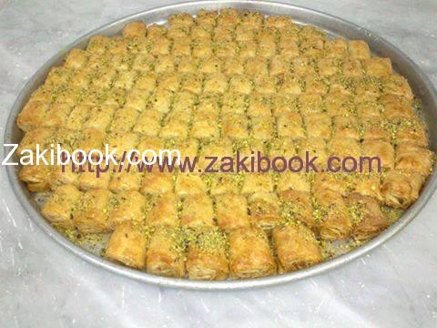 – رابعا \\ نسقى الصنيه بالسمنه على الوجه وتوضع فى الفرن حتى تتحمر وبعد أخراجها تسقى بالشراب البارد فور خروجها,وتزين بالفستق كما في الصورة.