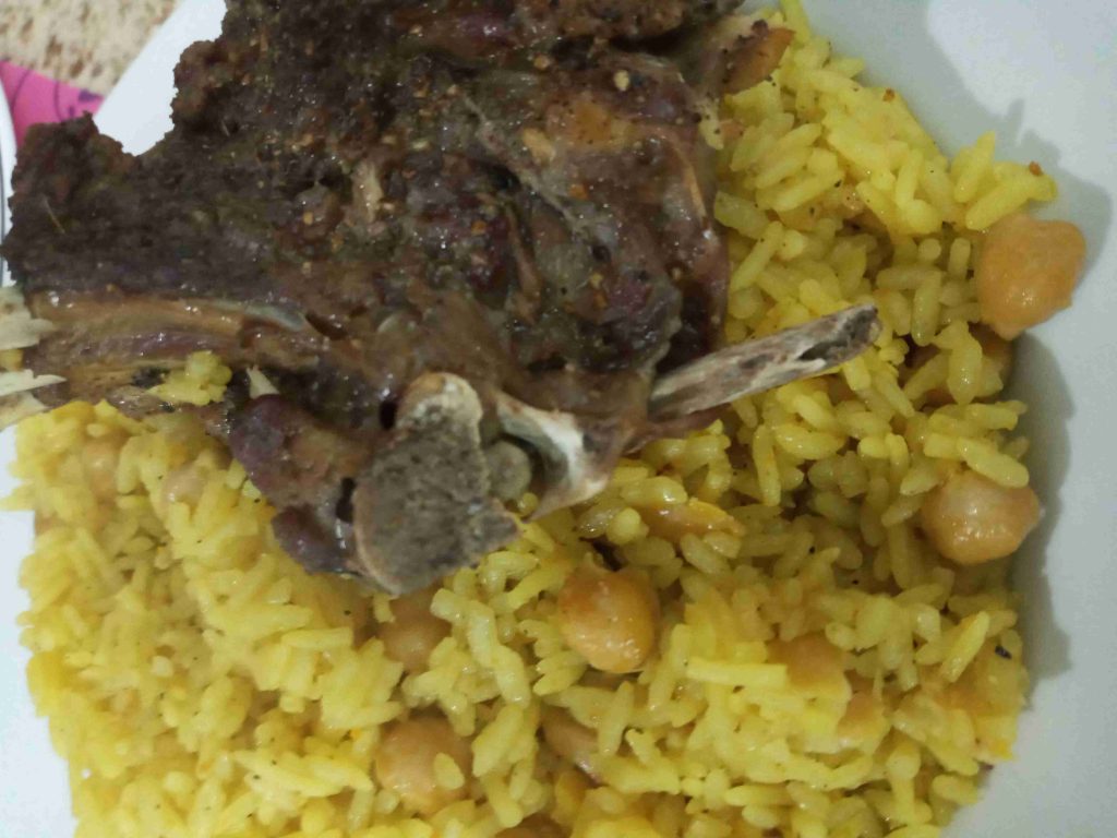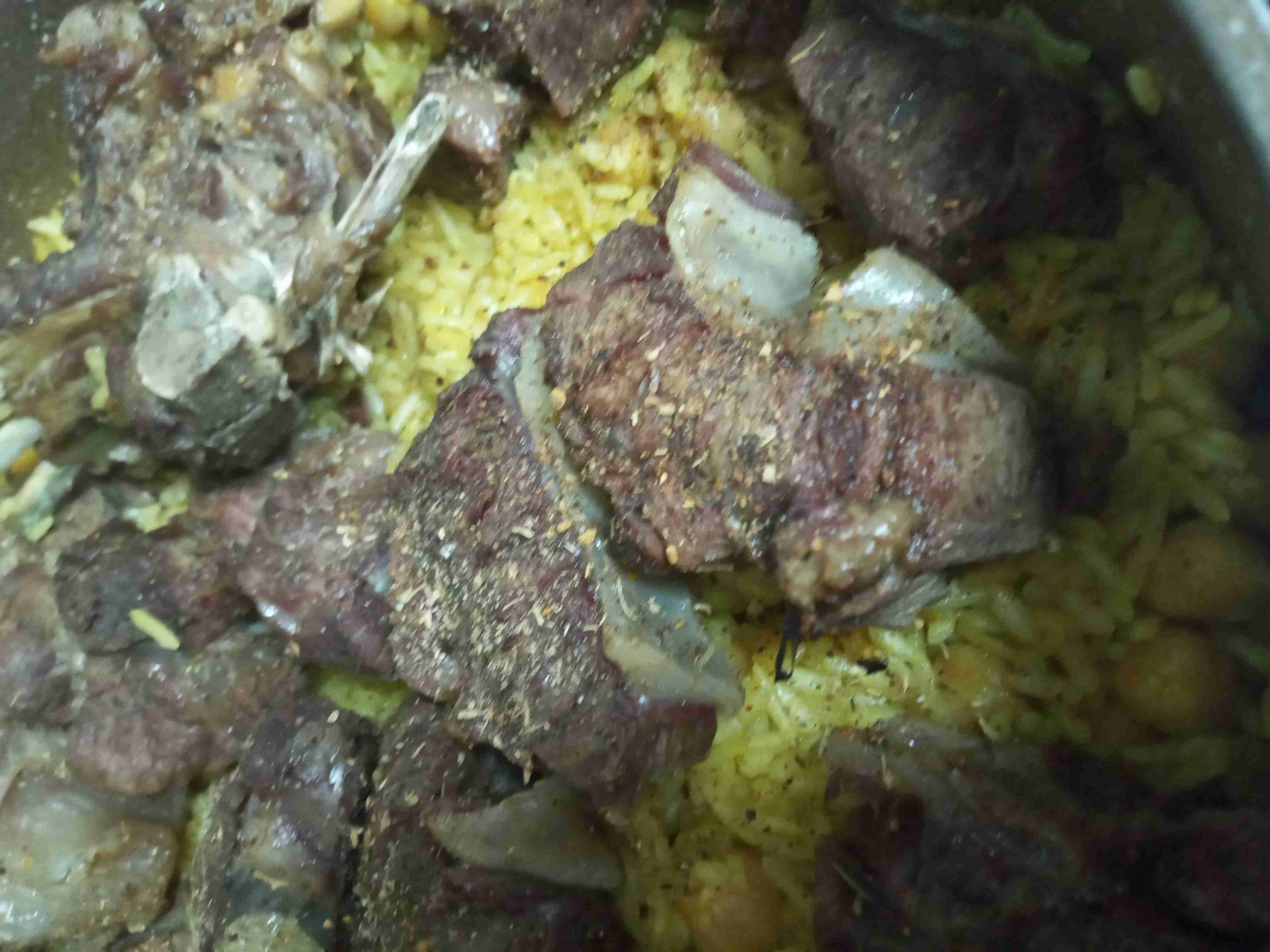 نسلق اللحمه لمدة 40 دقيقه في طنجرة الضغط بعد ما تستوي الحمه نصفي المرقه عنها ونضع البهارات وبعدين الحمص وبس تغلا نضع الارز ونتركه على نار هادئه وبعدين نضع الحمه في صينيه ونرش عليها البهارة والملح ونضعها في الفرن ونشويها وبعدين منشيلها منحطها فوق الارز ونتركها لحتى يستوي الارز ❤❤