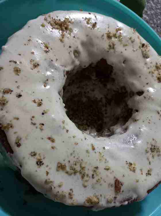 عند خروج الكيكة ننتظرها تبرد ثم نقلبها ونضع خليط الزينة ونضع الجوز