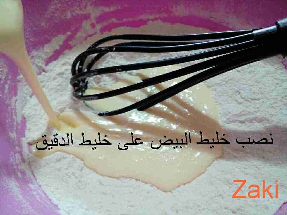نصب خليط البيض على خليط الدقيق مع التحريك حتى تنسجم المكونات.