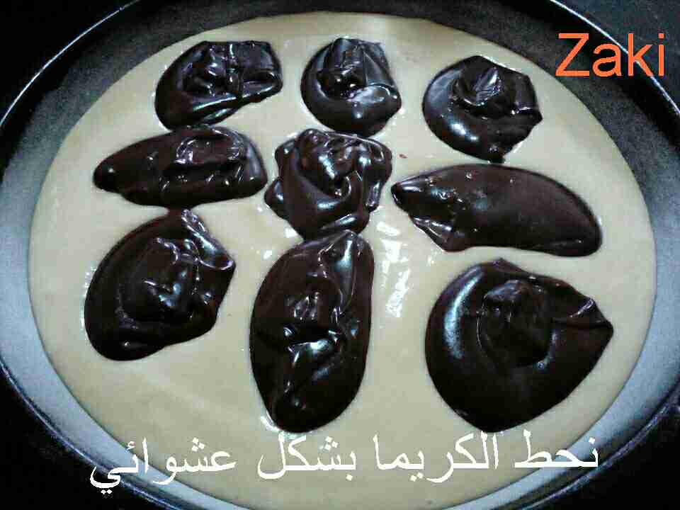 نصب الخليط في قالب كيك مذهون، و بواسطة ملعقة كبيرة نحط بشكل عشوائي مقدار ملعقة كبيرة مملوءة من كريما الشكولاطة على الكيكة، و ما تبقى من الكريما نحط منه مقدار ملعقة صغيرة على الجوانب المتبقية من سطح الكيكة.