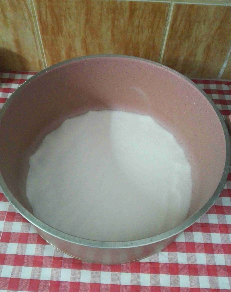 & اول شي نضع كميه من الملح بقعر الطنجره يلي راح نعمل فيها الكيك وبنكون مختارين قالب او صينيه تدخل الطنجره بسهوله وبنضع الطنجره وهي فيها الملح عالغاز عالحراره خفيفه عشان تسخن لحتى نجهز الخليط