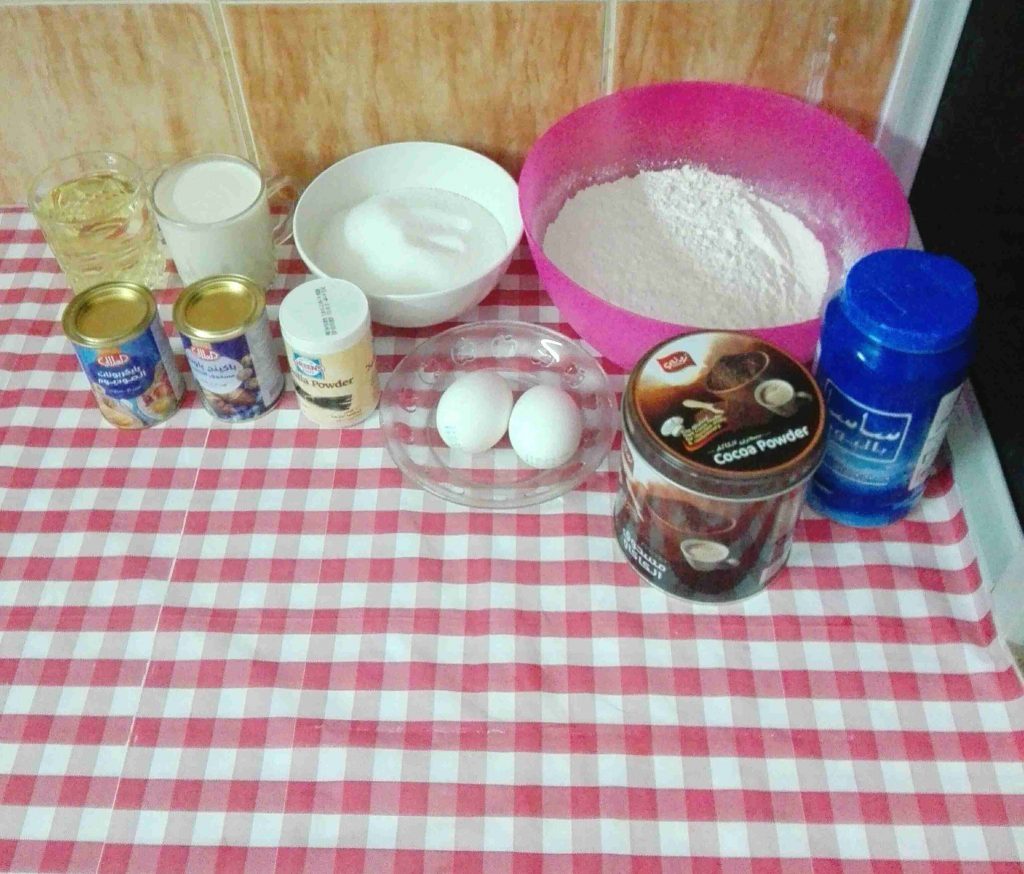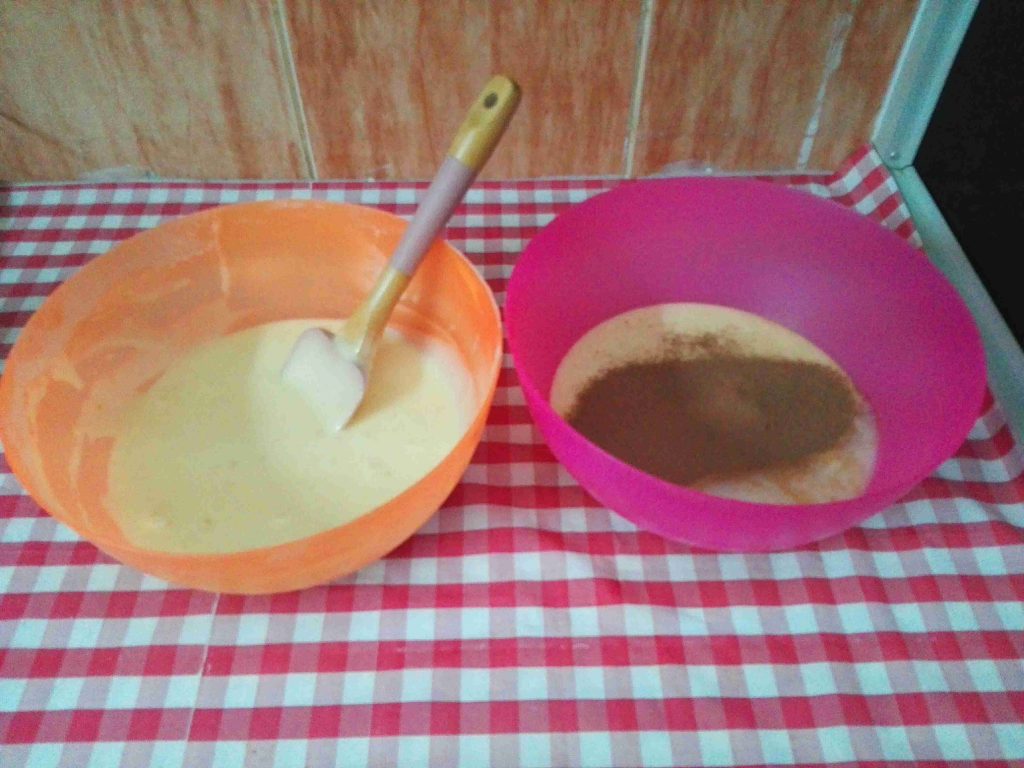 بنقسم خليط الكيك لقسمين وبنضيف الكاكاو عالقسم من خليط الكيك مع شوي من الحليب السائل وبنخلطهم مزبوط