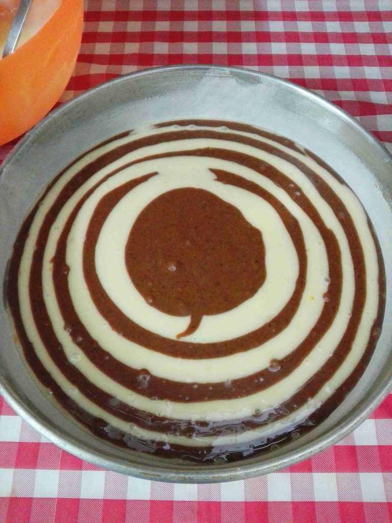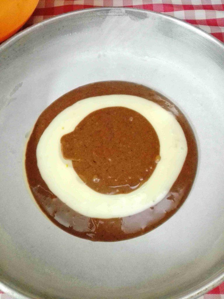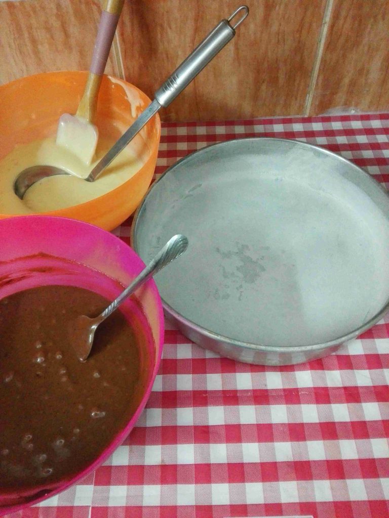 & بندهن الصينيه زيت وبنرشها بالطحين وبنبلش باضافة الخليط عالدفعات بنستخدم ملعقه كبيره او كاس وبنبلش باضافة جزء من خليط الكاكاو وجزء من خليط الفانيلا مره هيك ومره هيك وموضح بالصور الطريقه