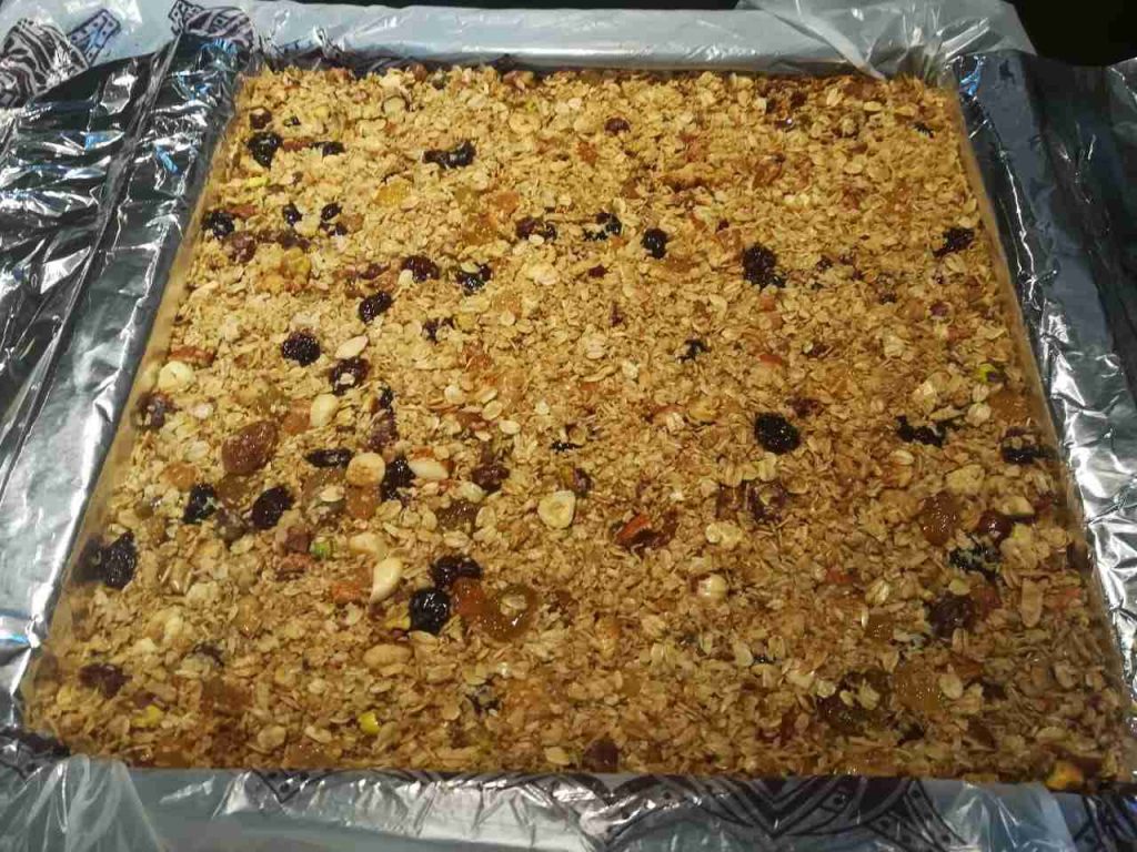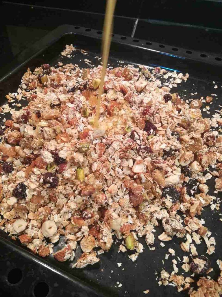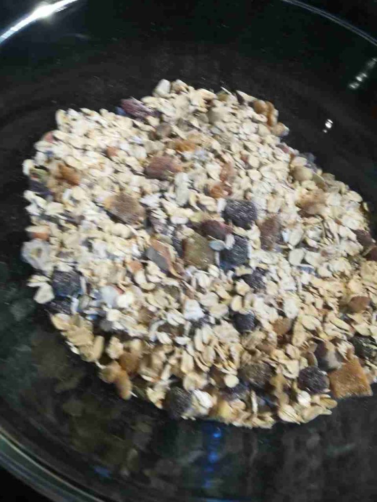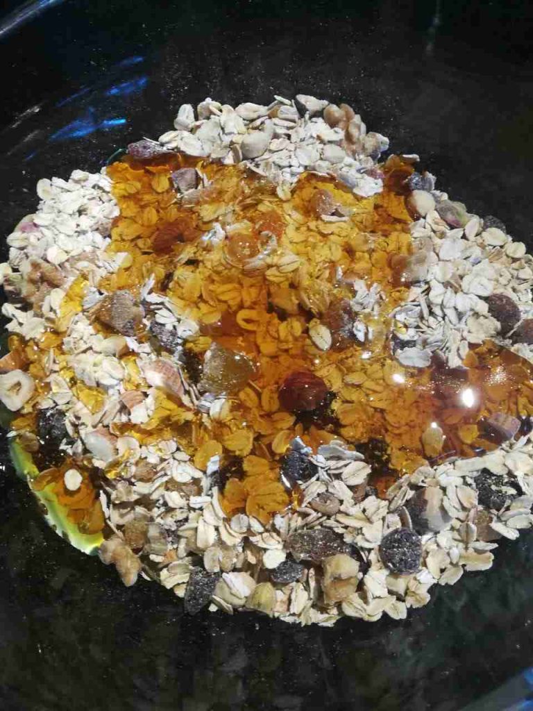 نضع الشوفان بوعاء كبير ونفرم المكسرات والفواكه المجففه ونضعها فوق الشوفان ثم نضع نص كوب عسل عليهم ونفركهم باليد حتى يتشرب جيداً العسل