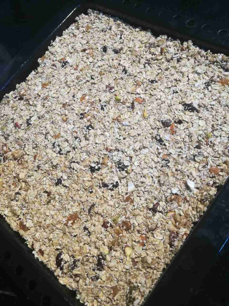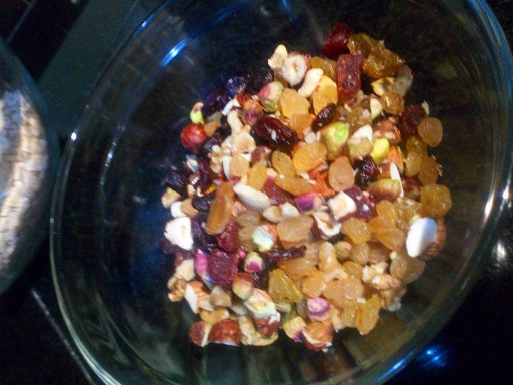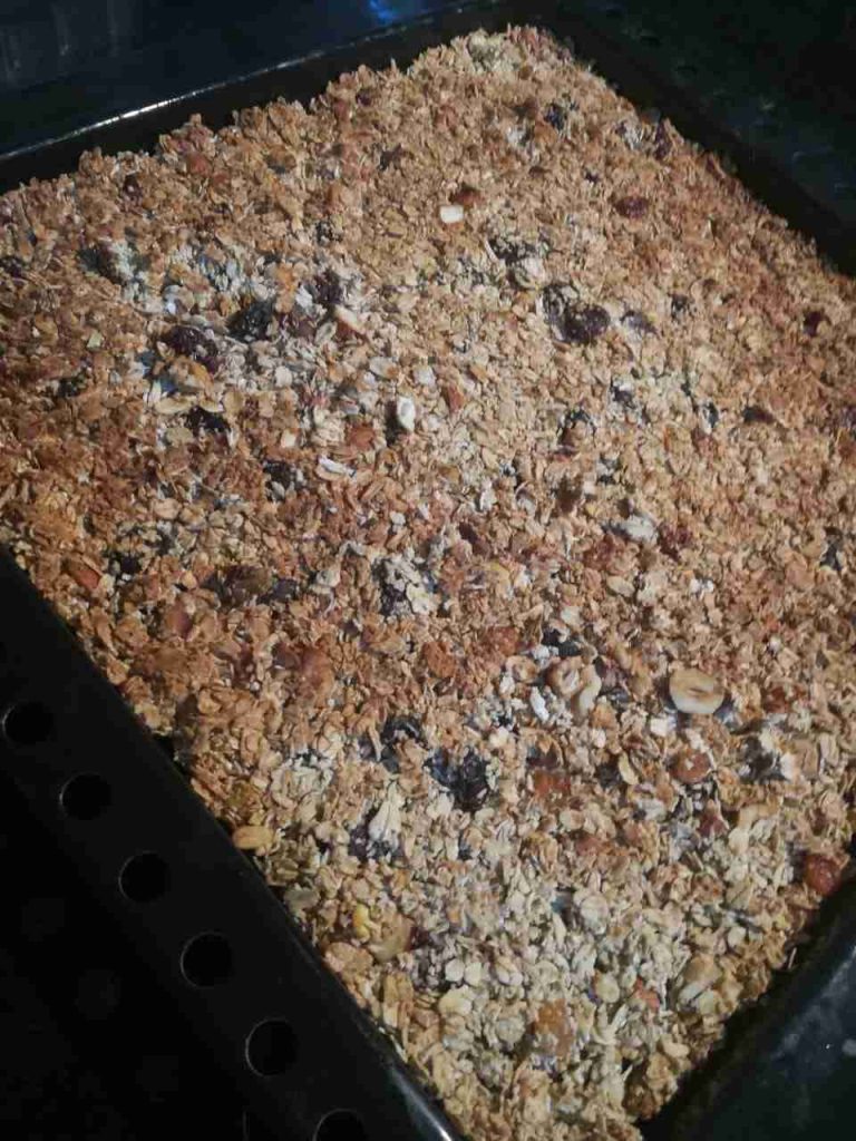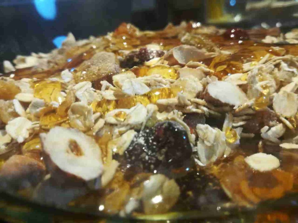 نضع الشوفان بوعاء كبير ونفرم المكسرات والفواكه المجففه ونضعها فوق الشوفان ثم نضع نص كوب عسل عليهم ونفركهم باليد حتى يتشرب جيداً العسل