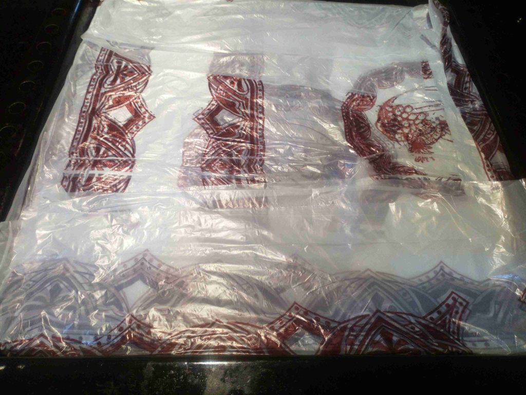 نضع خليط الشوفان فوق النايلون ونبسه باليد ونغطيه بالنايلون ونضعه بالثلاجة لمدة ليلة كاملة