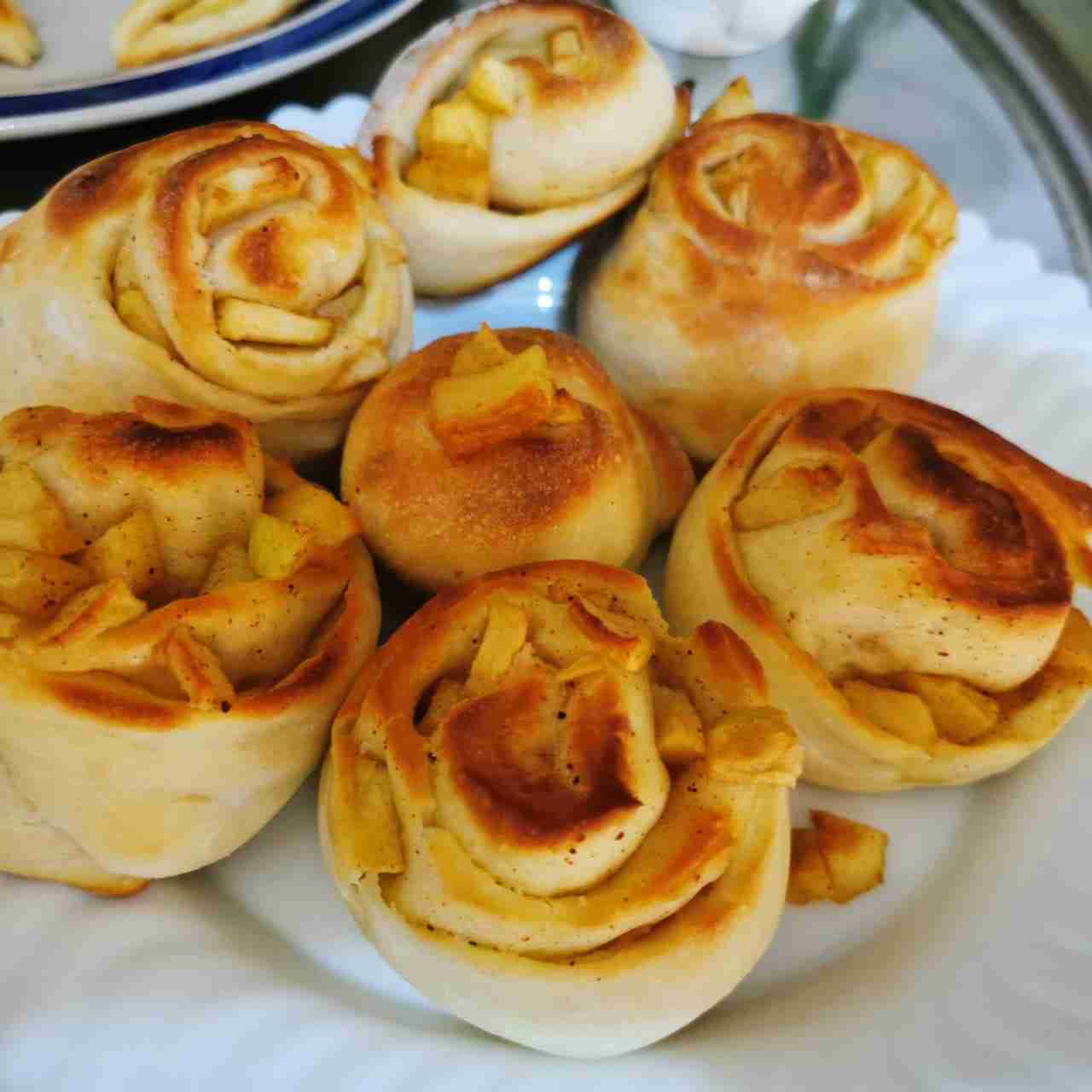 طريقة اللفائف نفرد العجين مثل الرغيف وندهن بالزبدة ثم نضع خليط التفاح المقطع ونلفها مثل الساندويش ونقطعها