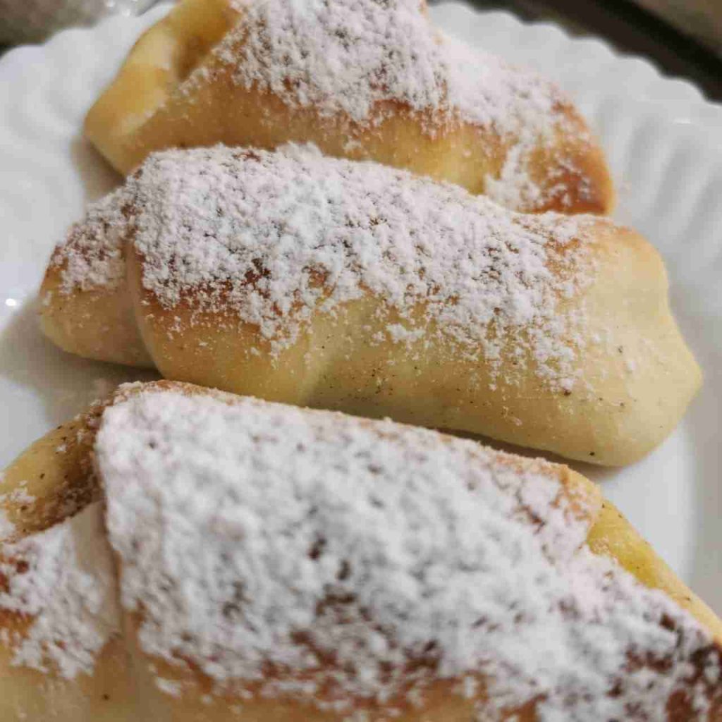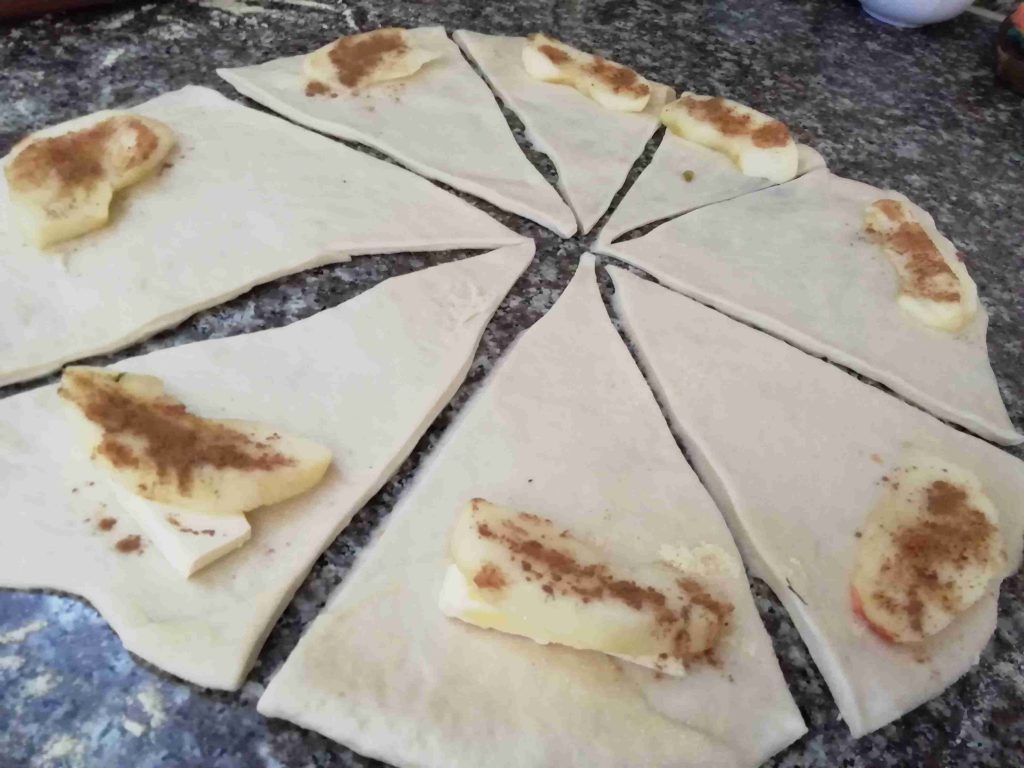 نفرد العجينة مثل الرغيف ونقطعها مثلثات ونضع في كل مثلث قطعة زبدة وفوقها قطعة تفاح ونلفها مثل الكروسان