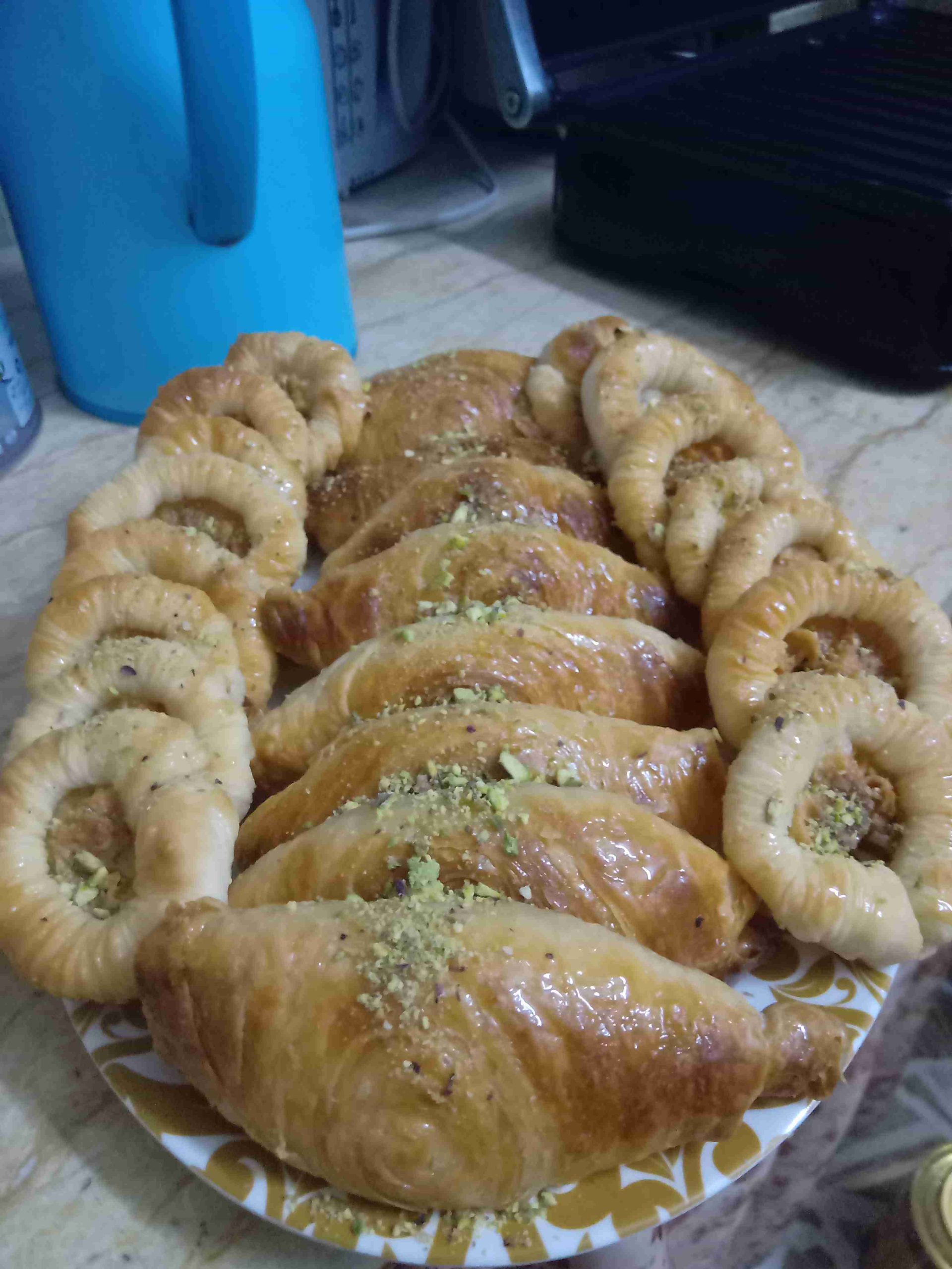 بعد أن تتحمر و تأخذ اللون المطلوب نخرجها من الفرن و نسقيها بكمية من القطر ( شيرة )الدافئ الثقيل