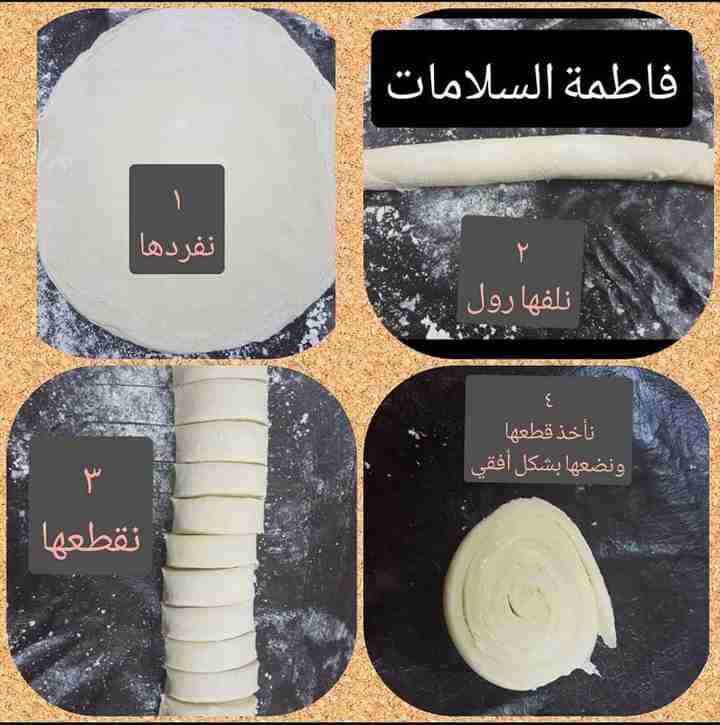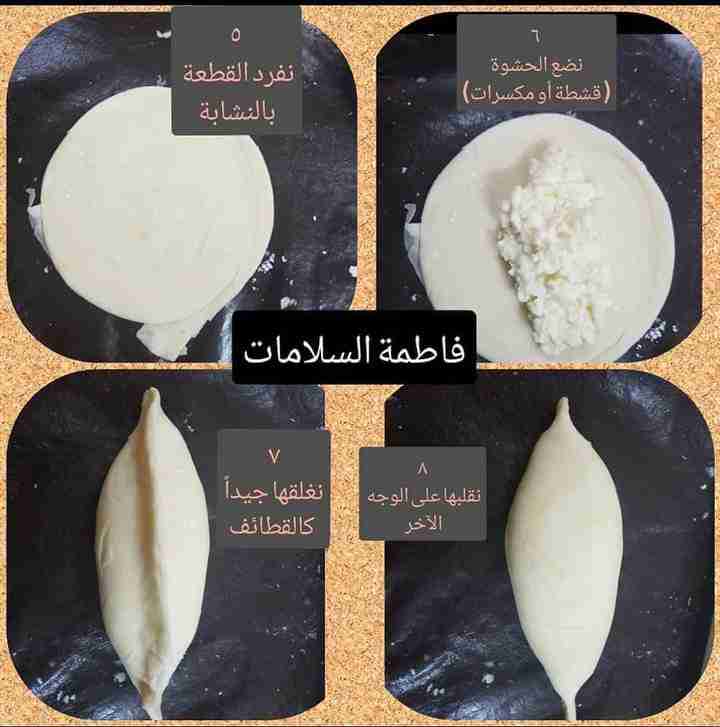 نغطيها بالنايلون حتى لاتنشف ونتركها ترتاح ربع ساعة تقريباً ثم نبدأ بفرد كل قطعة بالنشابة ( الشوبك ) من دون نشا فرد خفيف ونضع الحشوة و نشكلها حسب الرغبة ( ممكن تشكيلها ب ٣ أشكال كما هو موضح بالصور )
