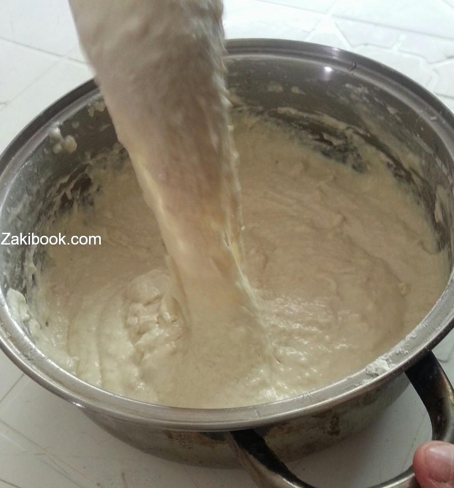 بتعجنيهم كلهم بمي دافيه المي مالو مقدار عندي بتحطي شوي شوي مي لما يصبح معك اتخن من خليط الكيك وضلك اخفقيه لما يتجانس الخليط واتركيه يختمر ساعتين ﻻزم يشبع تخمير