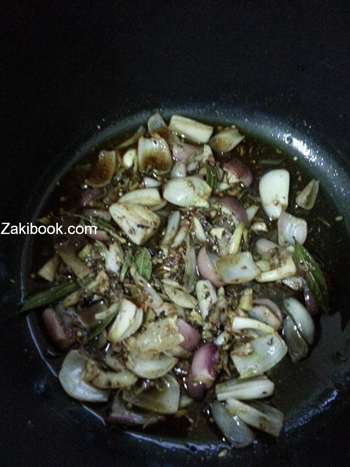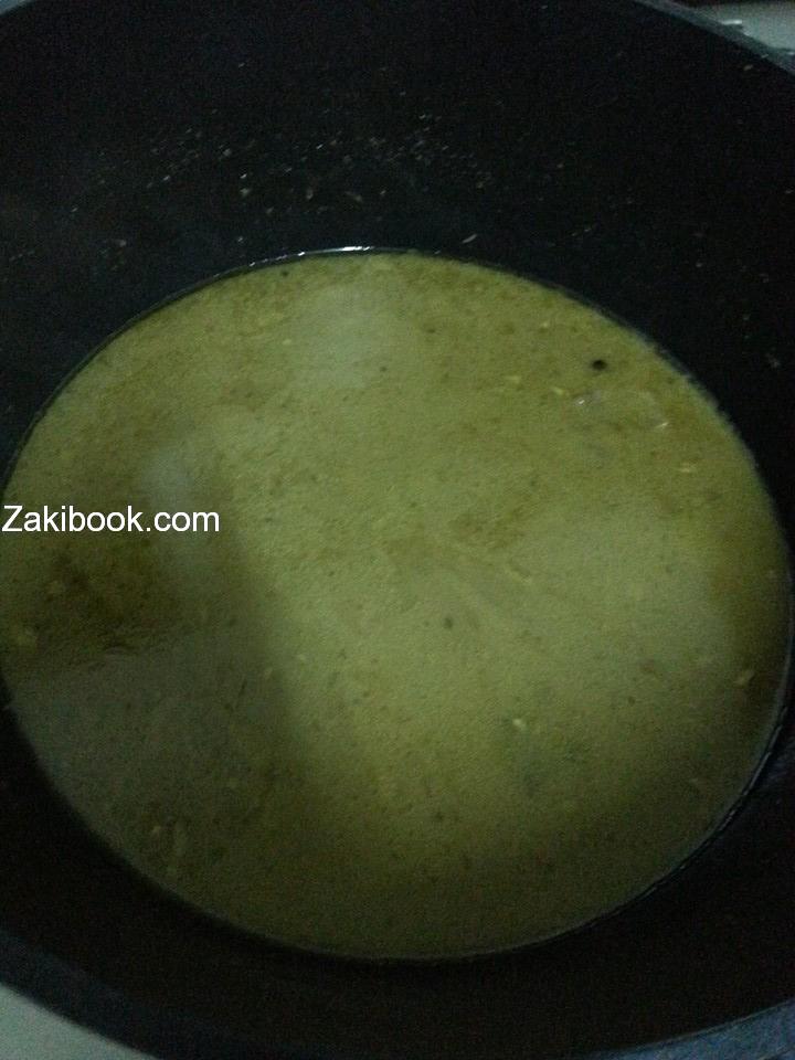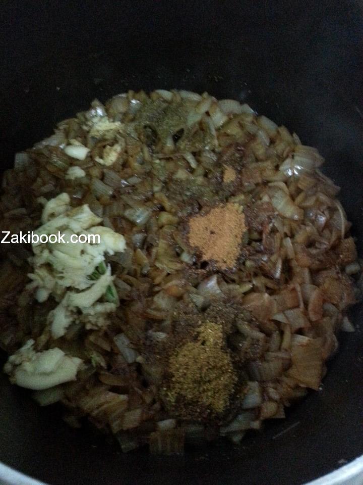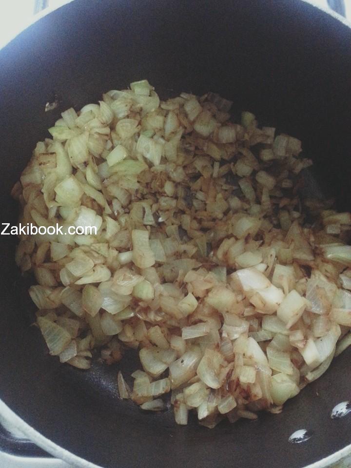 نفرم 3 بصلات ونحطها بطنجره بدون زيت ونقلبها لما تصبح بني فاتح ثم نضع نص كوب مي لحتى يدبل ويستوي
