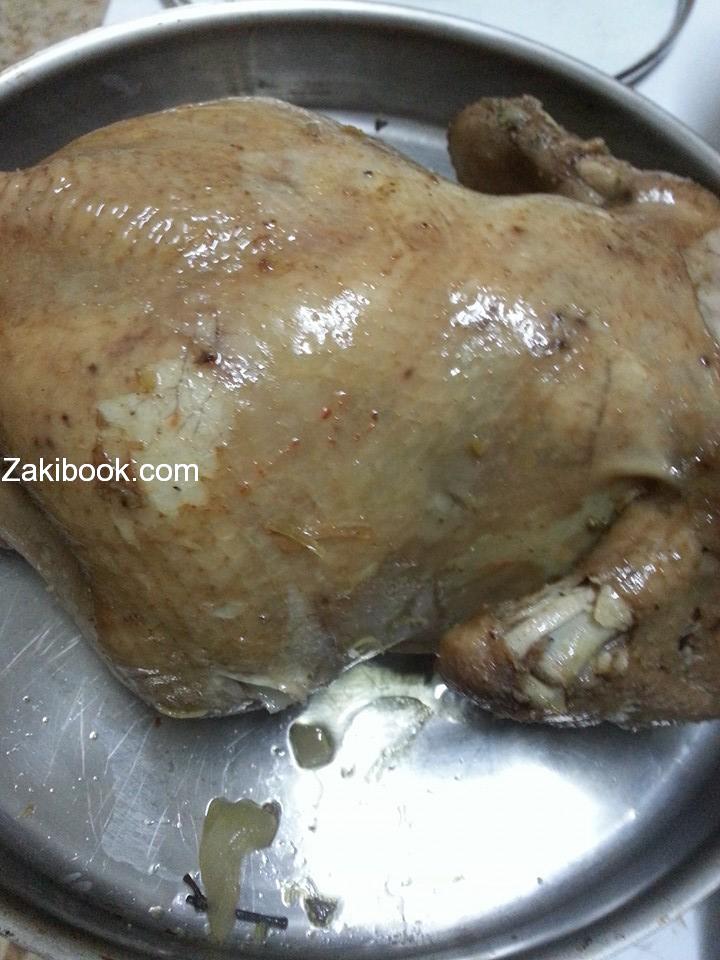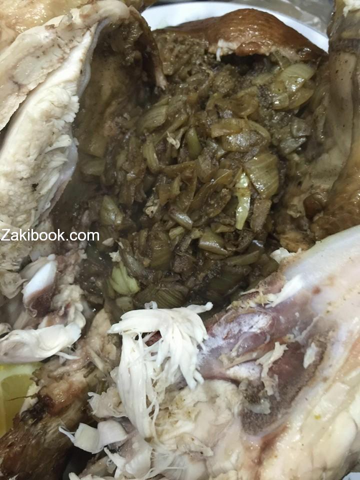 هذه الحشوه الدجاجه بعد ماانشوت طبعا ندهن الدجاجه باازعفران المنقوع ونرش شويه بهارات عليها