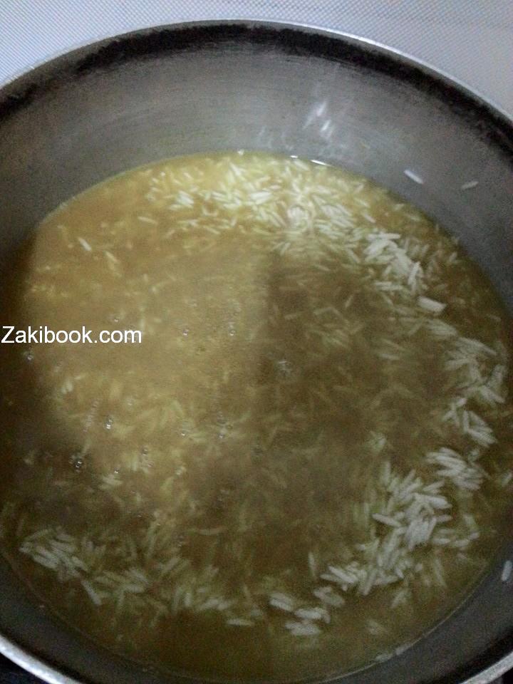 بطنجره اخرى نضع الرز المنقوع بالماء والخل المصفى الخل يجعل الحبه اطول ومفلفل ونصفي المرقه ونضعها عاﻻرز على نفس مستوى الرز نتركها لما تستوي
