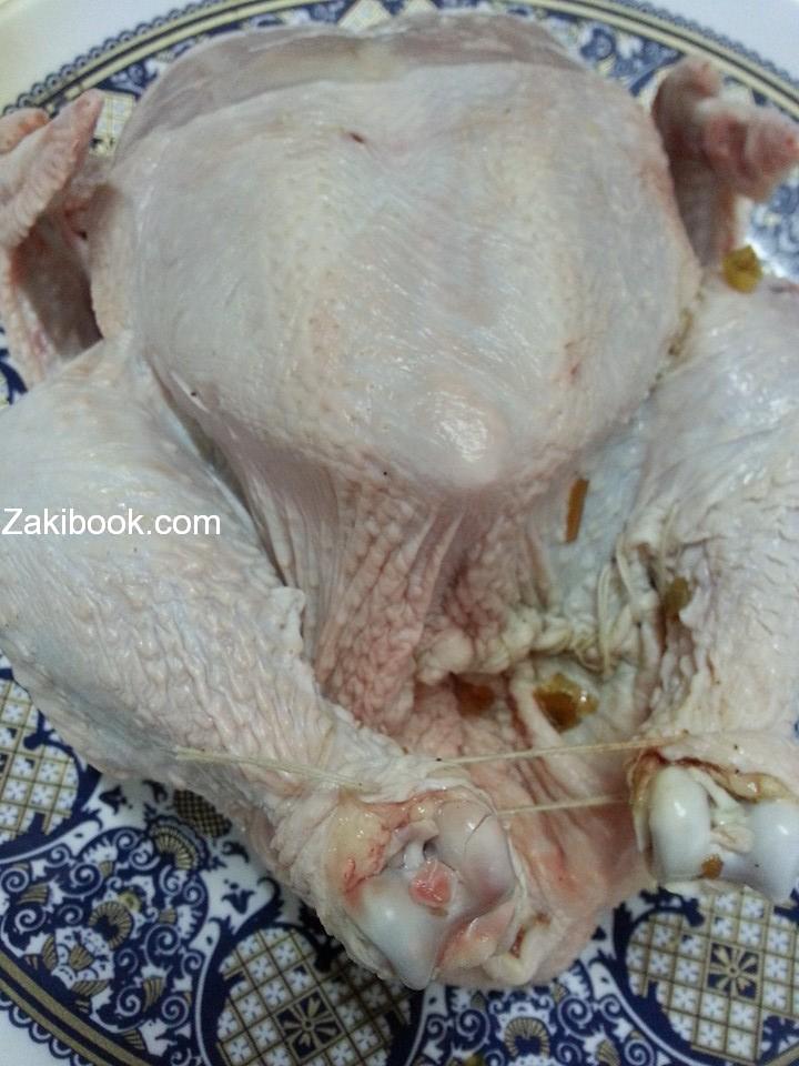 ونحشي فيها الدجاجه جيدا ونخيط الدجاجه بخيط عريض